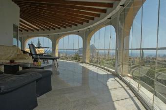 The villa is located in one of the most beautiful parcels of Calpe, with spectacular views towards the sea, the city and the surrounding mountains. Plot 2,750 m2, planted with 20 palms, numerous cypresses, three pine trees, oleanders and many other species. All plants are automatically watered and fertilized by a system of computer-assisted irrigation. Parking, a huge double garage and a single garage + outdoor parking, underfloor heating in complete house and air conditioning. Door opener with video intercom. By the access internal swimming pool is a sauna, shower, toilet, urinal, sink and footbath, and roof stains and `starry sky` above the tubbad-hidromasaje. Upper floor guest apartment with two bedrooms, bathroom, kitchen and terrace. Ground floor guest apartment, living, outdoor kitchen, two bedrooms, outdoor pool area, swimming pool 5 x 10 m, and area of the principal house with two bedrooms, two bathrooms, terrace type `Naya` glass, a wonderful entry, large windows, very brightly, it gives a very good and quiet and spacious feeling to be there. A villa with a lot of true lust.