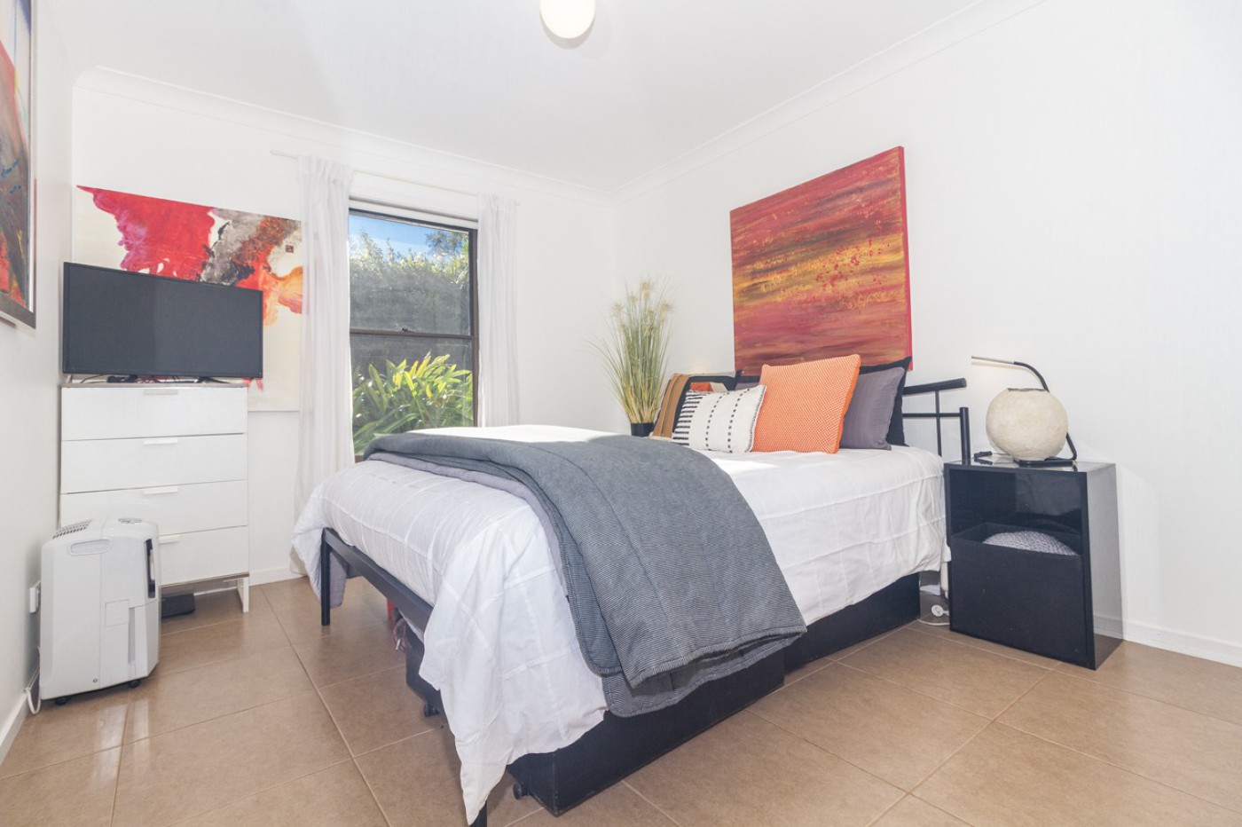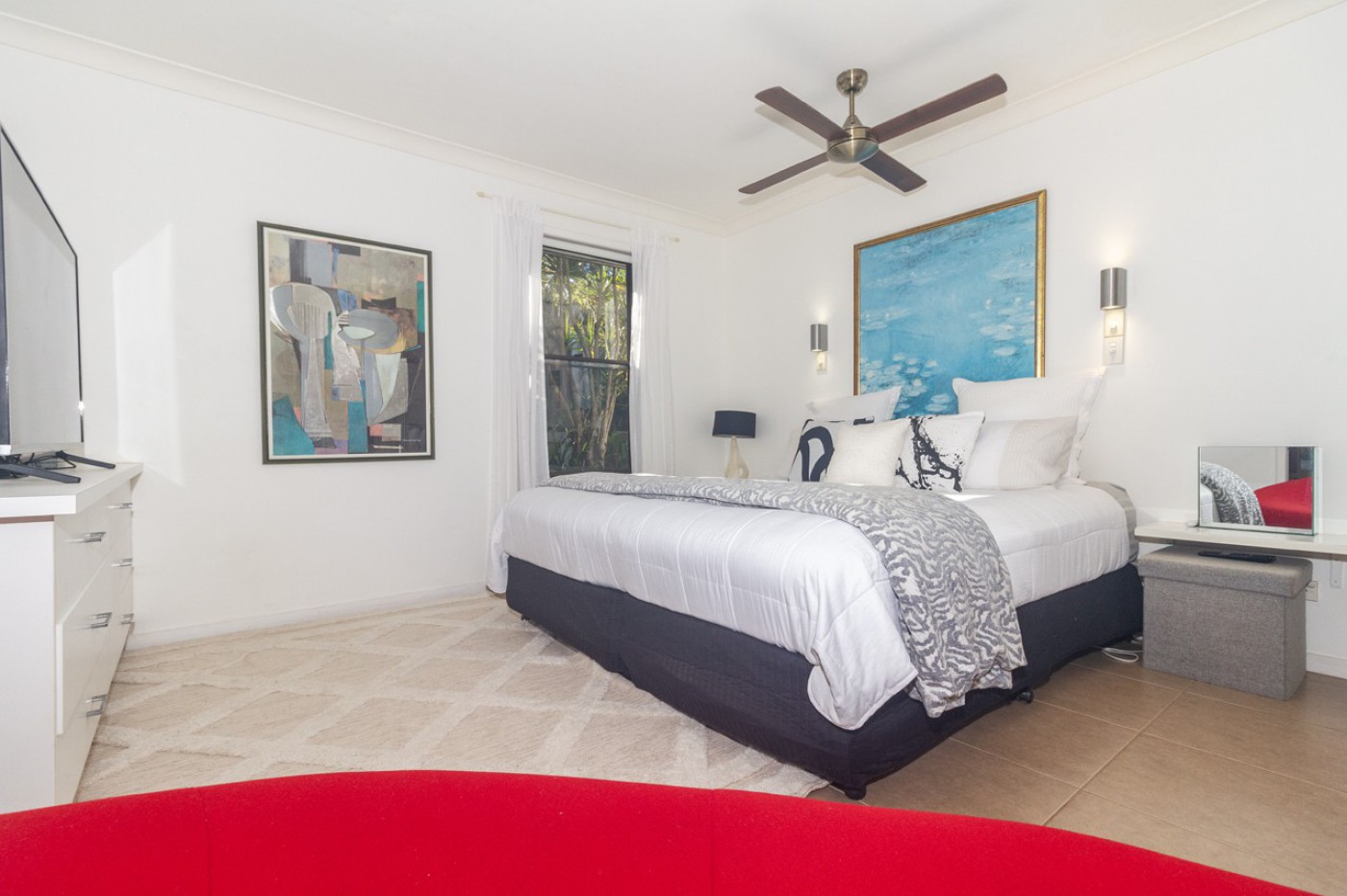 The generous main bedroom, with spectacular bay views, has glass sliding doors
