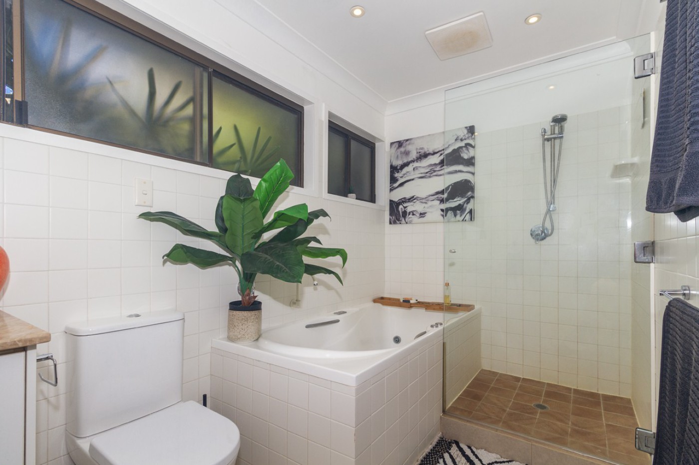 has an extra-large spa bath, full glass shower, toilet, and corner vanity, which
