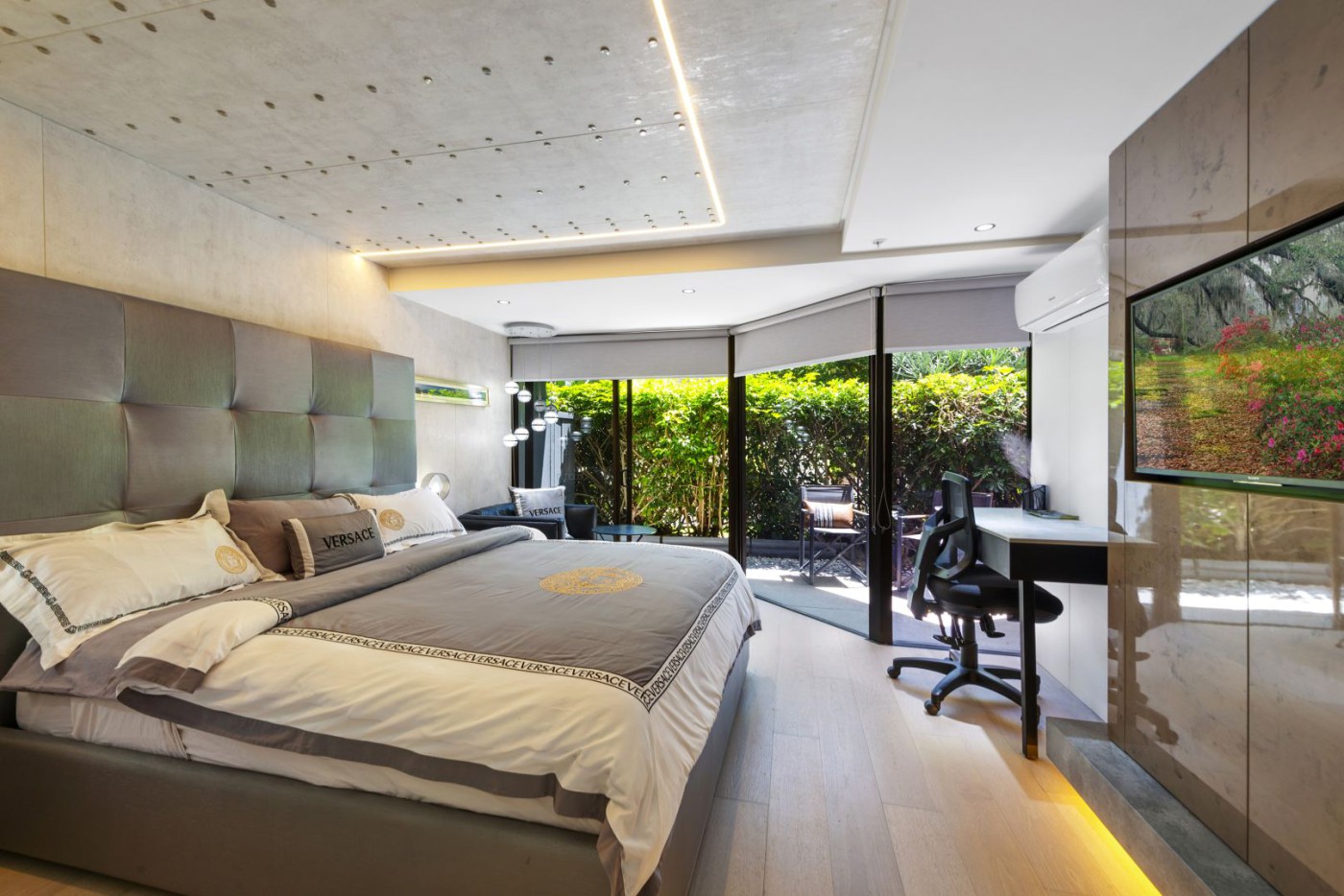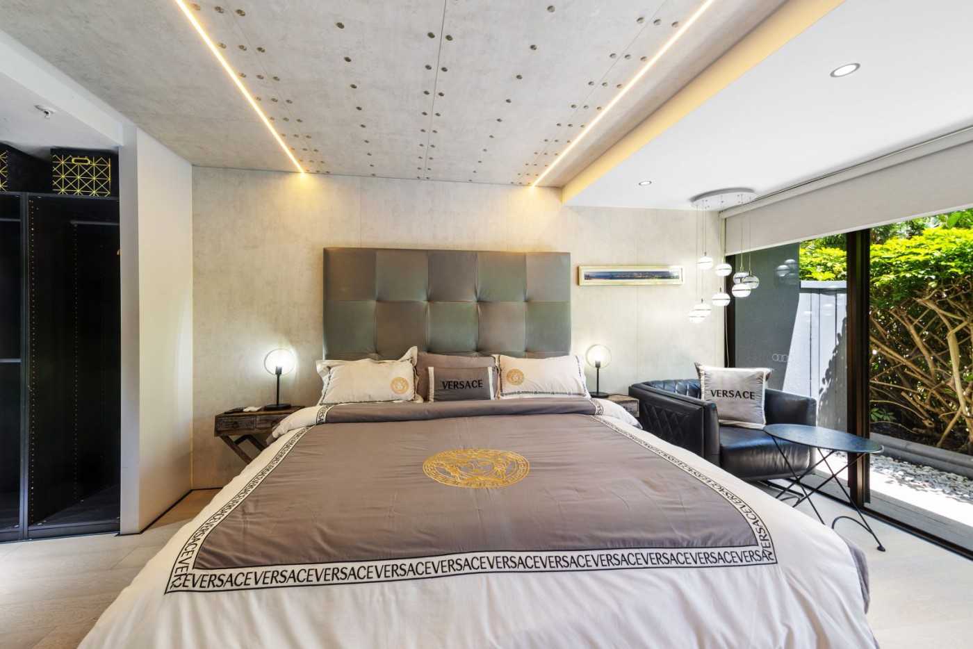• Extra large master bedroom, featuring ceiling-mounted lights and private garden views