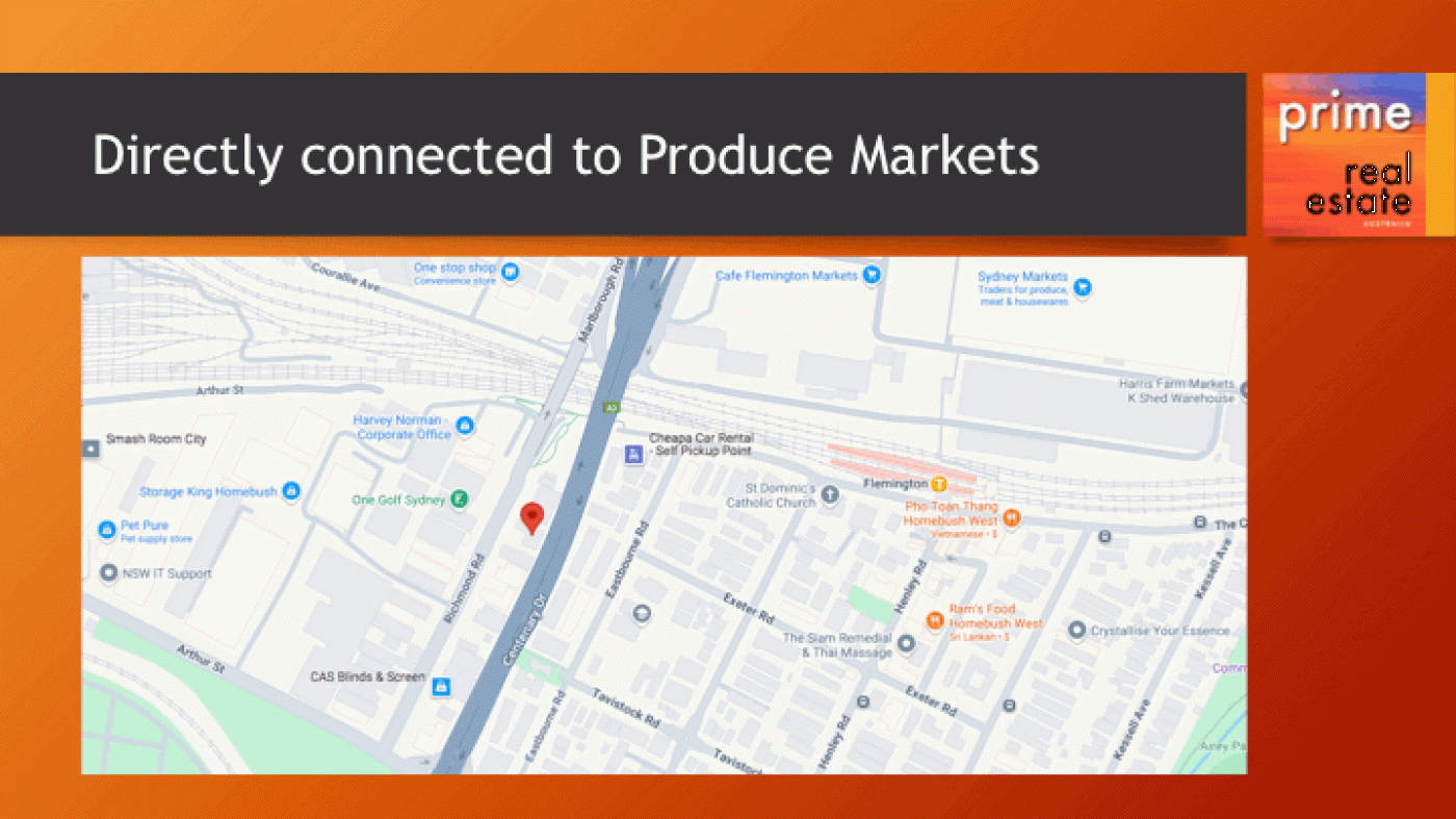 What do you get? • 1160 m2 of commercial/industrial land • Currently 660m2 amalgamated factory/warehouse size Currently 660m2 amalgamated factory • Solid double brick building • Three phase electricity • Production level over 2 storeys • Office Space • Ample storage space • 6 car parking spaces • Top location, directly next to Flemington Produce Markets • Direct connection to East-West and North-South Motorways • Train service (Fast train from Strathfield) from Homebush • Flexible settlement period