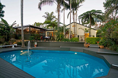 The large solar heated, salt chlorinated swimming pool is encased in approx 300mē of decking overall. A small lawn area with steps leading down to a private gate opens to the back rainforest and into a totally private cleared rainforest sitting area.