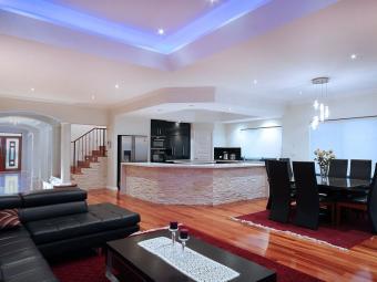 * The huge open plan living area of kitchen/dining/lounge has solid Kempas timber flooring throughout