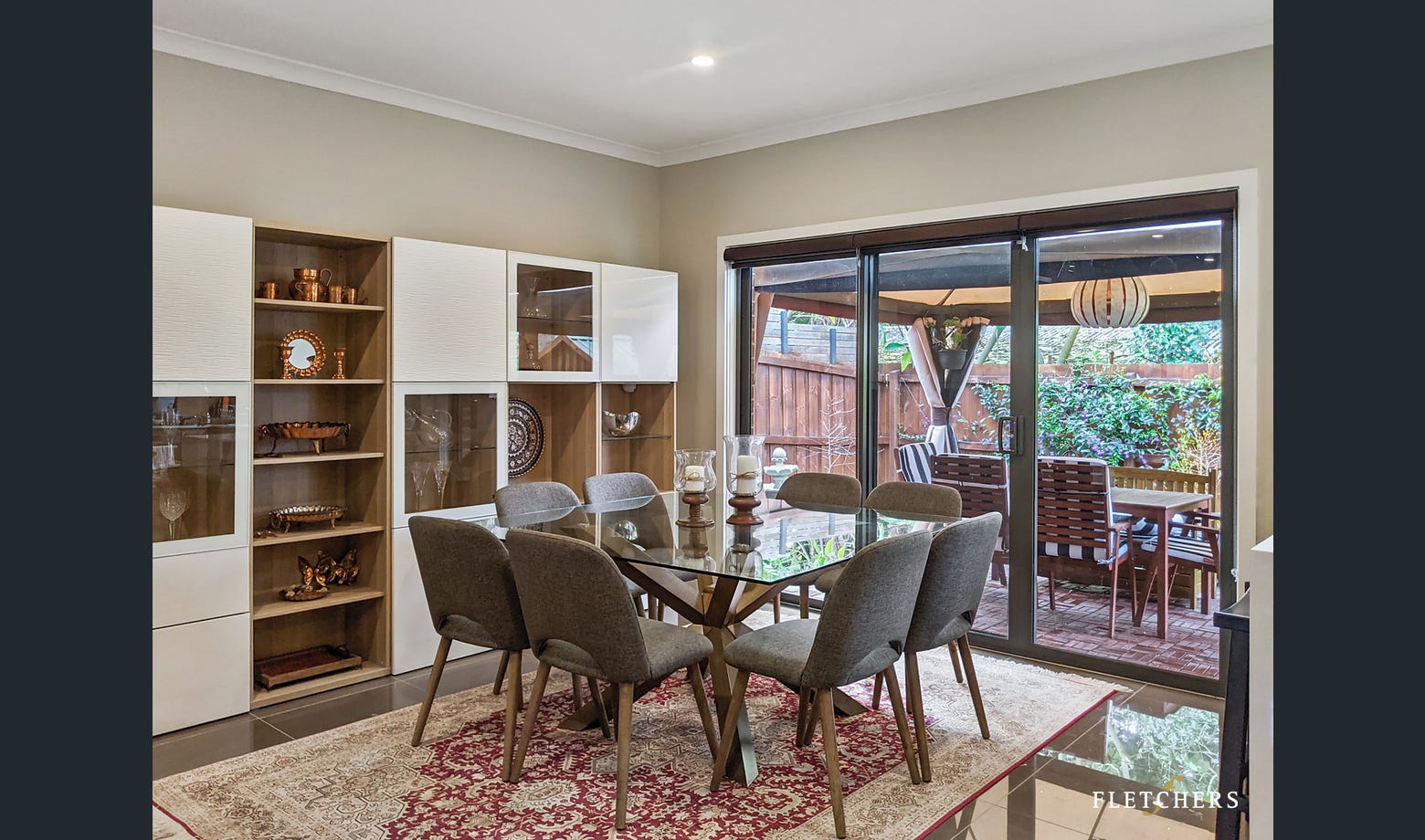 Transitioning outside, a private yard with a gazebo and a synthetic lawn area, offer easy entertaining plus