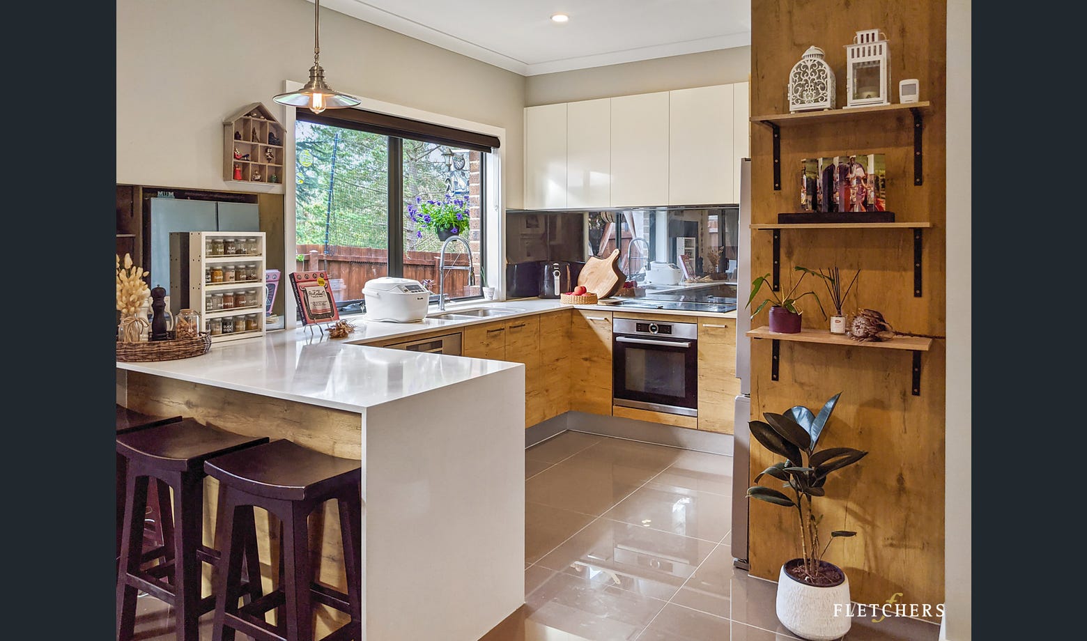 * Vogue timber and stone-accented kitchen with European stainless steel appliances
