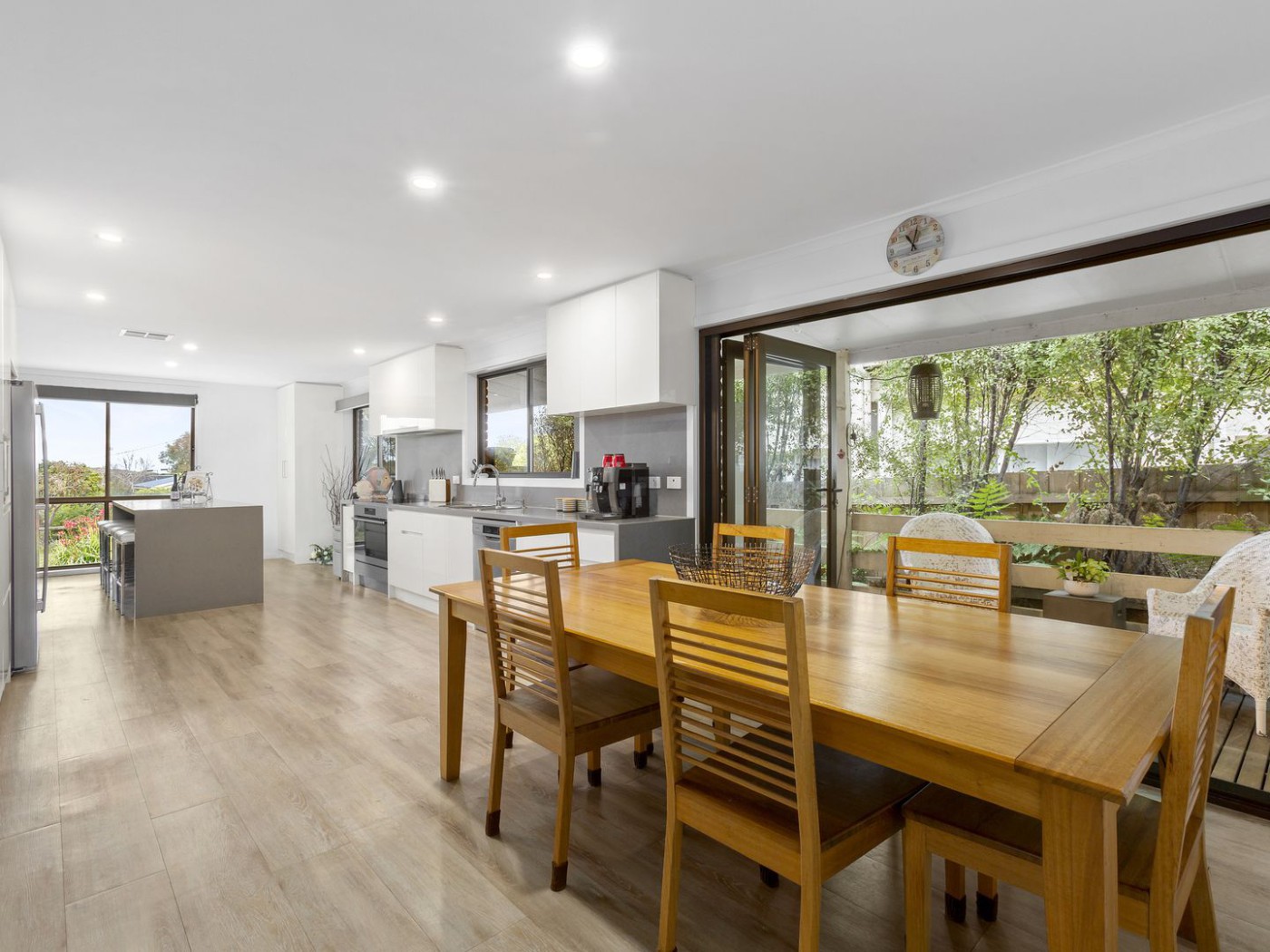 Adjacent to the kitchen is a spacious dining area with wide bi-fold doors that open to the outside