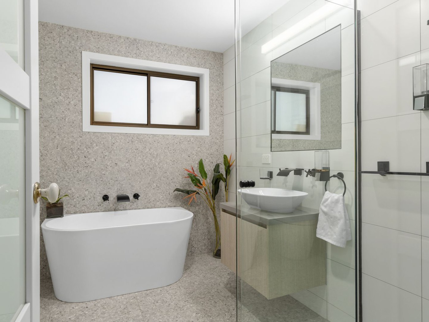 full-height glazing, dazzling natural light, feature black tapware, frameless shower screens, plus a heated