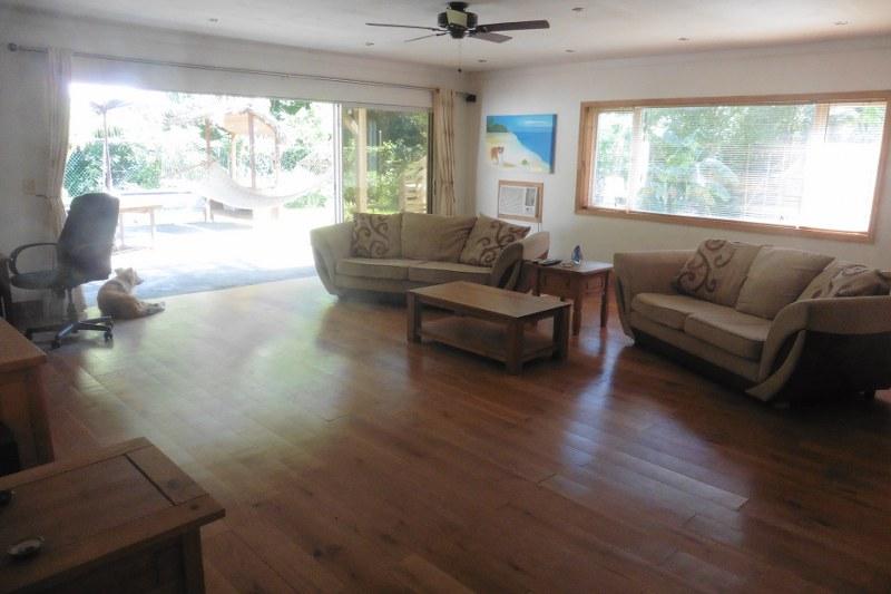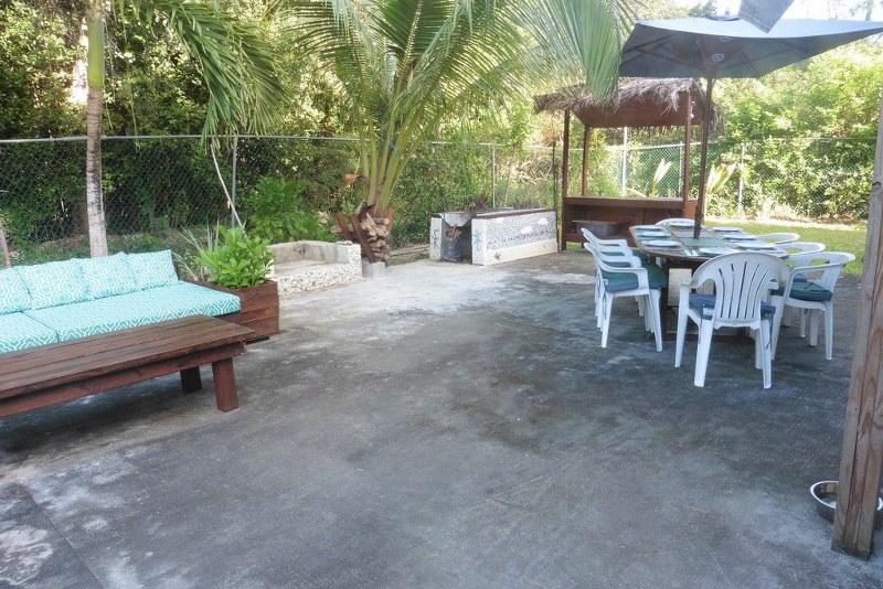 Outside is a large garden with plenty of stuff growing in it including pineapple, mango, papaya and bananas. There is a concrete patio (around 55 foot by 25 foot) running the entire length of one side of the house which we have built into an outdoor kitchen/dining area.