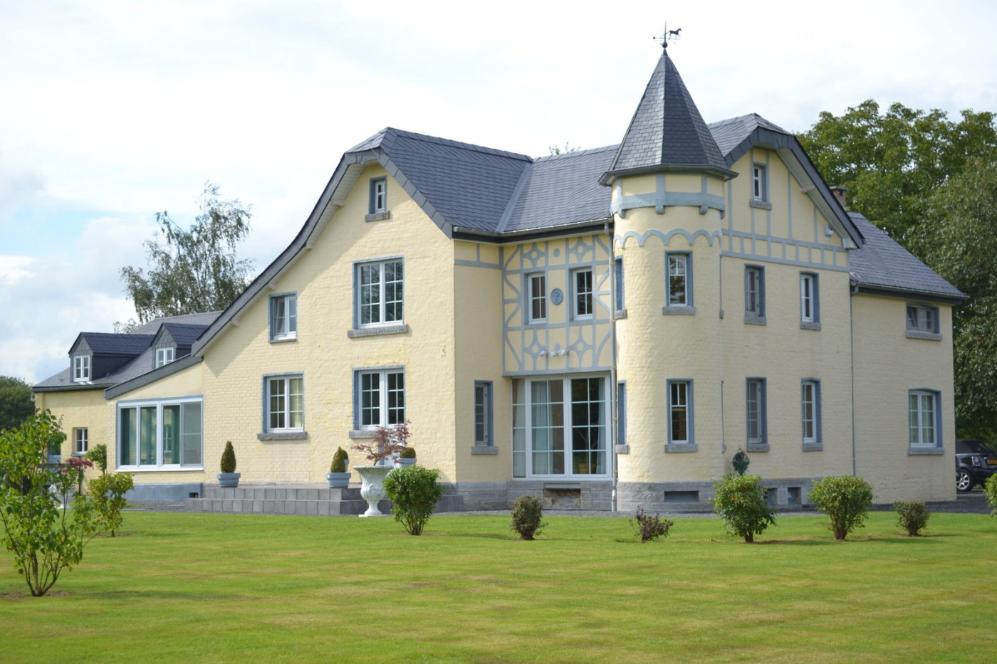 Magnificent manor house located in Chardeneux, in one of Belgium`s most beautiful villages, completely renovated in 2009, with 524m² of living space. A true mansion 10 minutes from Durbuy. Exceptional materials: marble fireplaces and floors, natural slate roof, staff moldings and motifs, oak doors and parquet flooring, beech staircase in the round tower.