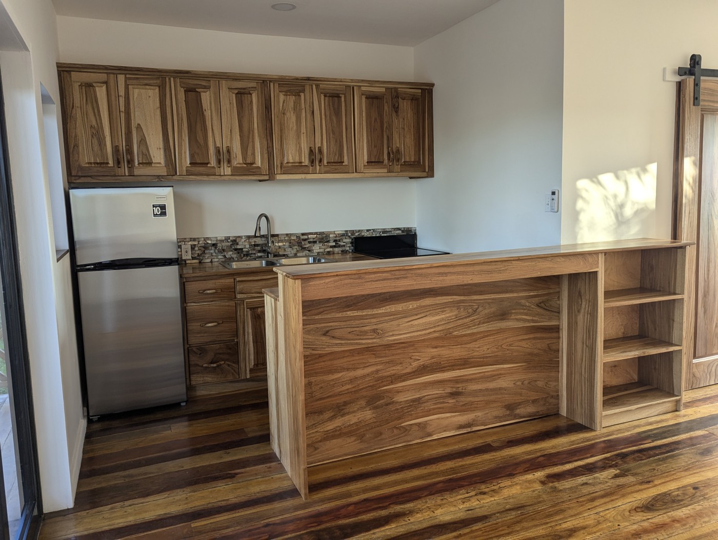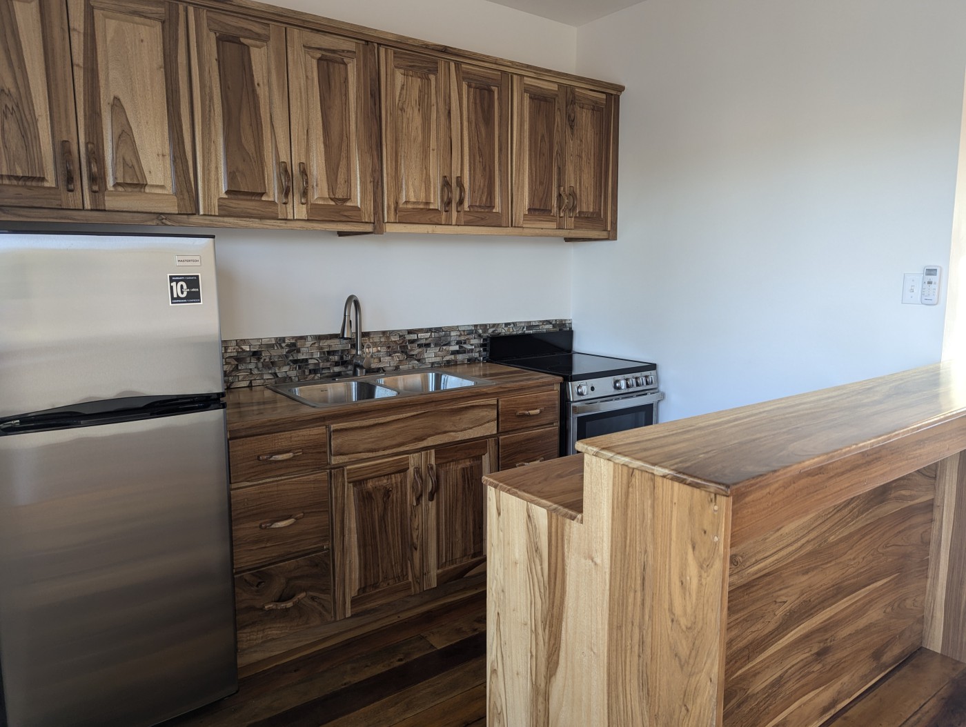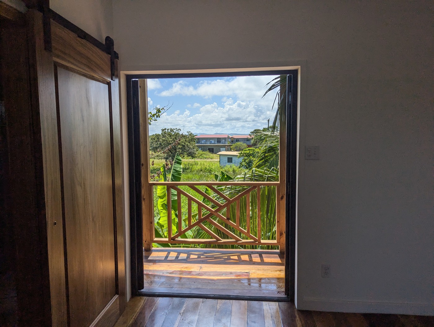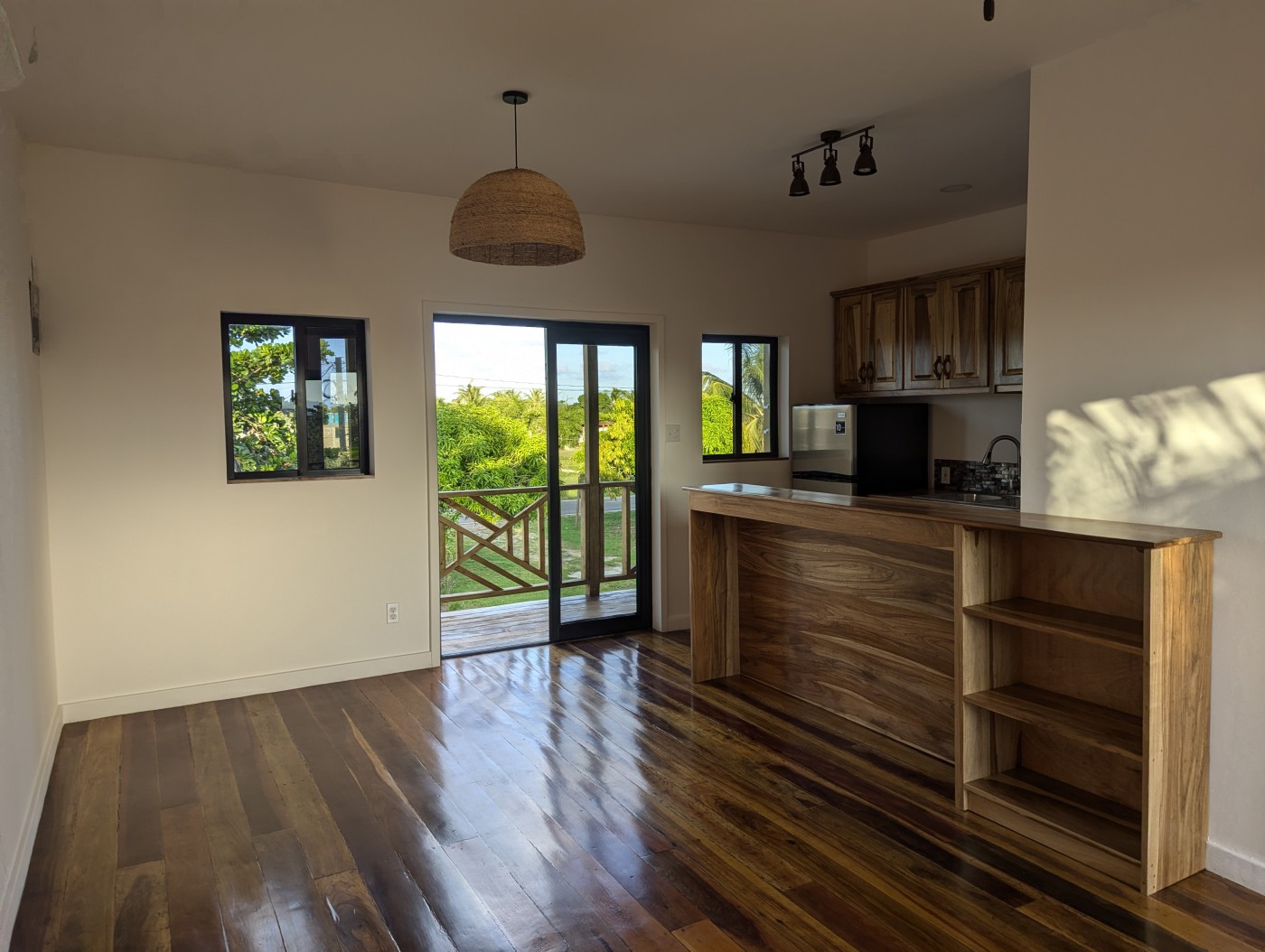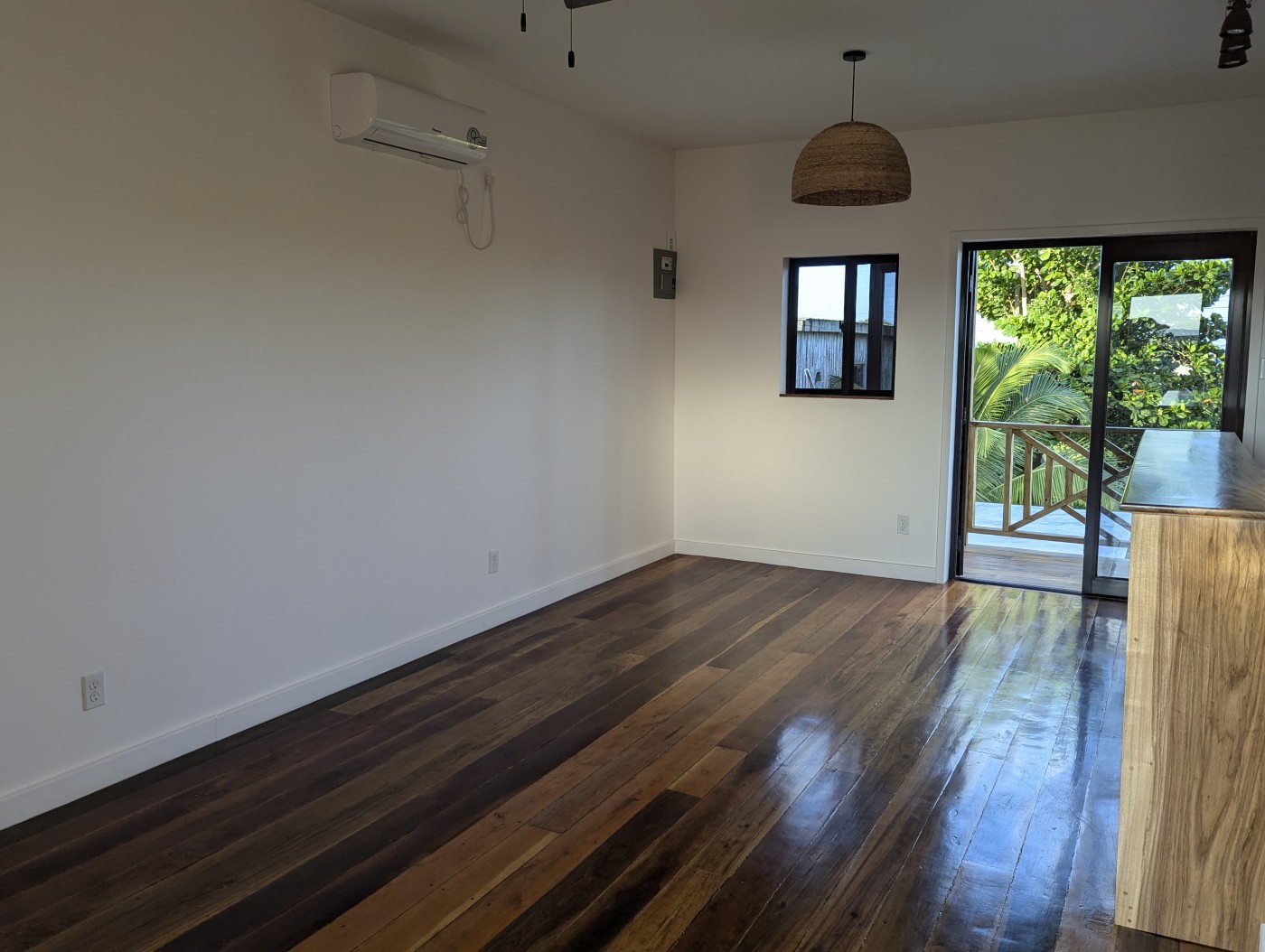 The floors are hand-sanded (meaning not perfect) mixed Belizean hardwoods. The framing is wood construction with 16-inch centers, which complies with North American building standards. There is insulation between the upper and lower units, as well as in the roof space and all the walls which helps keep your unit cooler.
