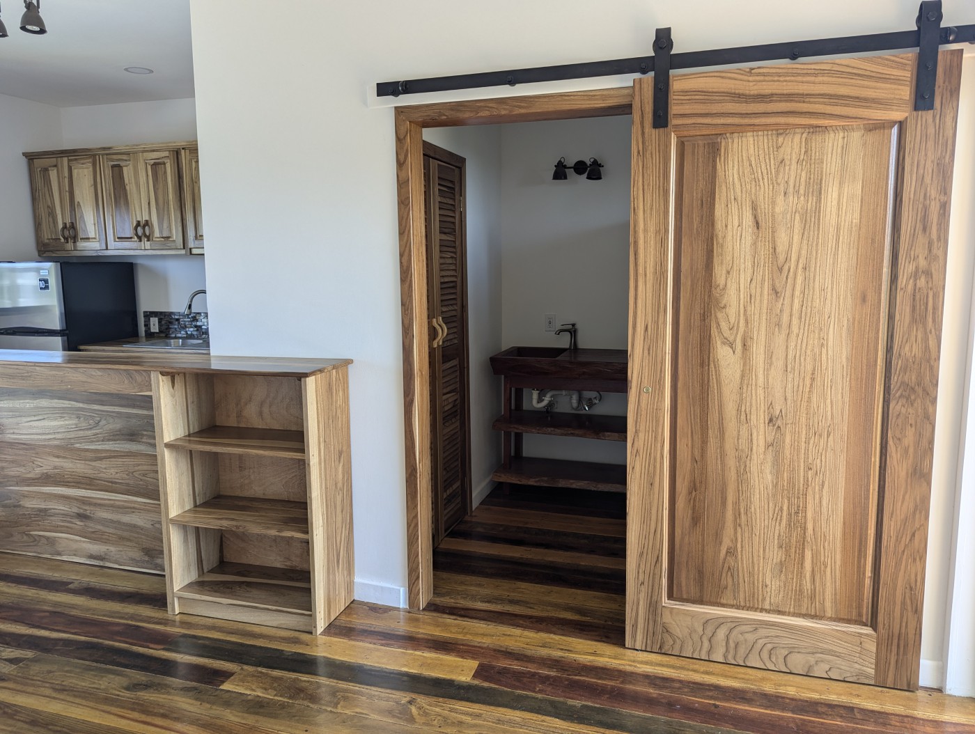 A 3-pce bathroom vanity has been hand carved with live-edge hardwoods crafted by a carpenter in Belize. Glass door and glass blocks form the shower enclosure. There is also a built-in closet for clothes and linens.