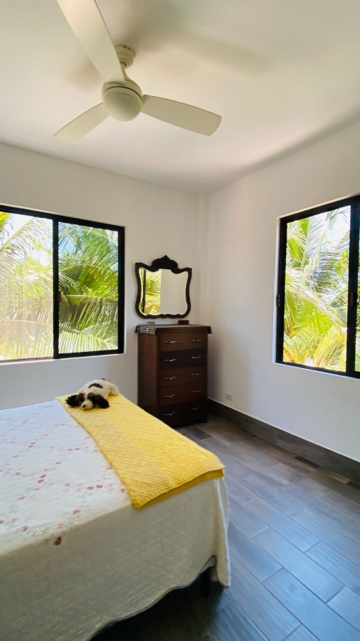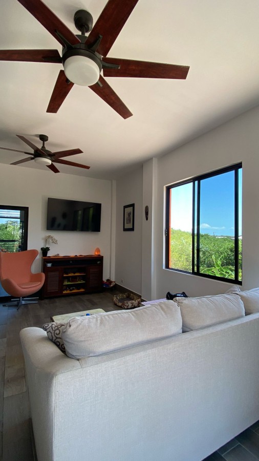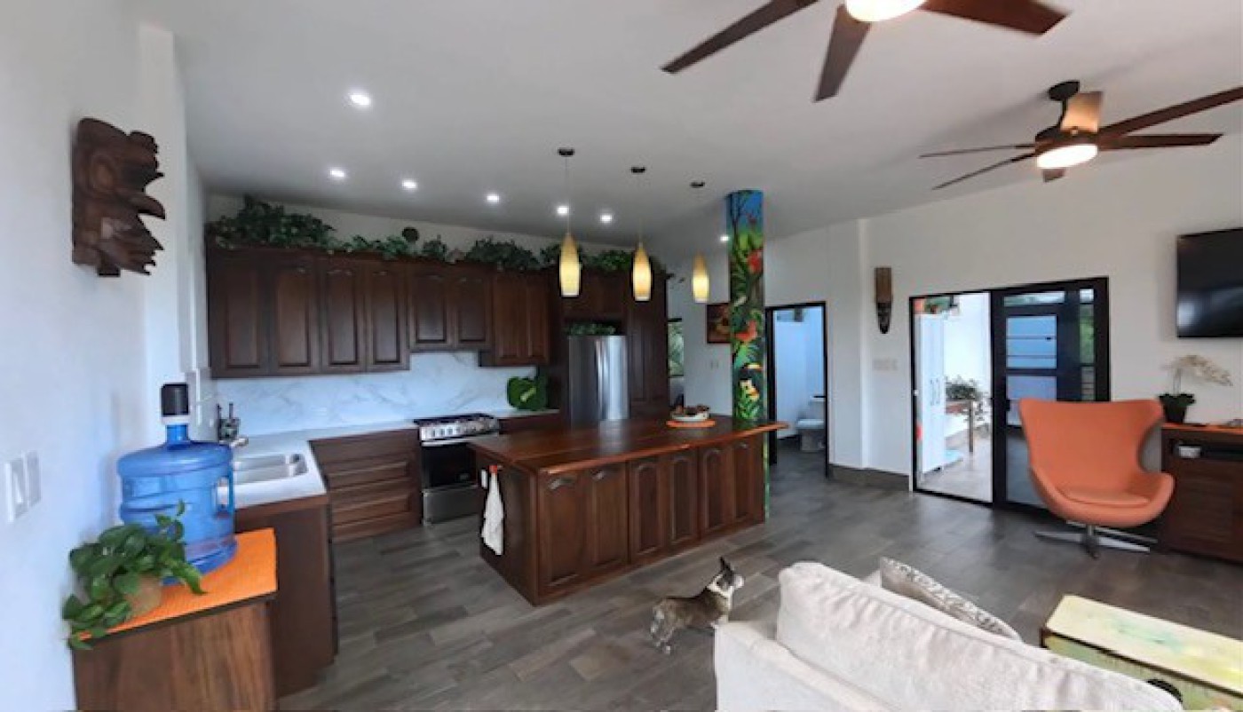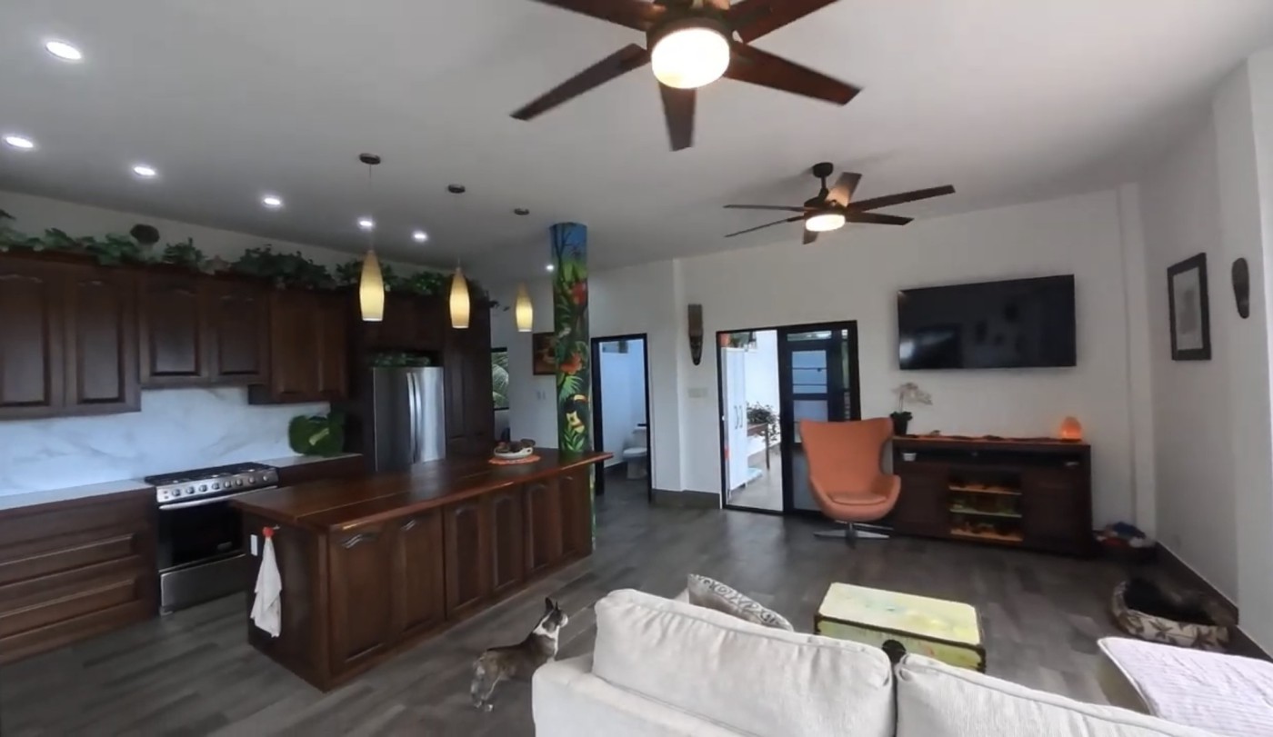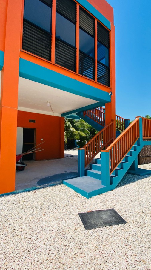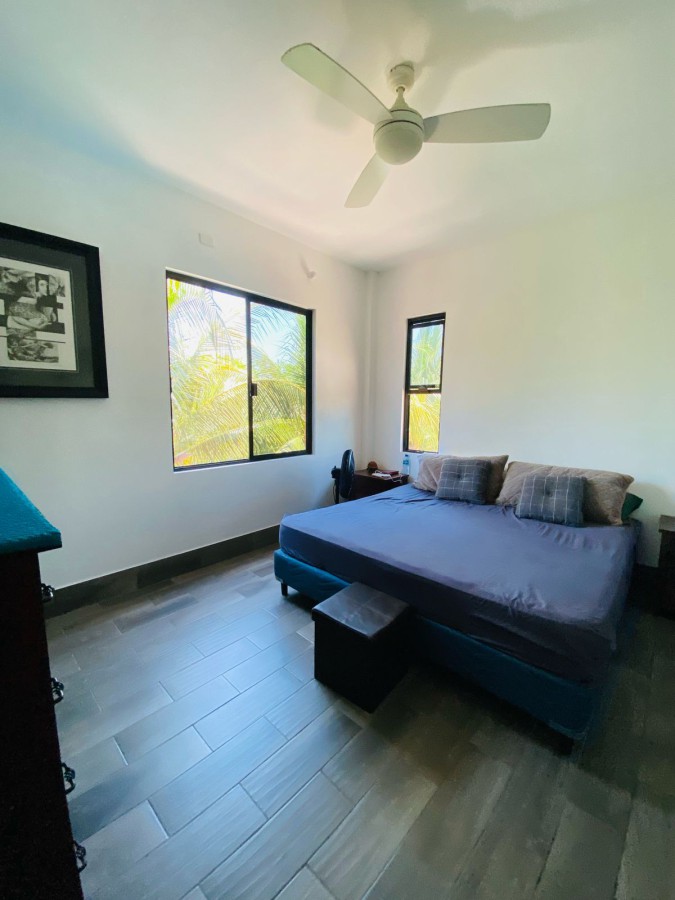 The heart of the home is undoubtedly the semi-furnished kitchen, adorned with exquisite Belizean exotic hardwood cabinets and an inviting island that beckons culinary enthusiasts. A linen closet conveniently sits nearby for added storage. Adjacent to the kitchen is a beautifully furnished bathroom that complements the modern aesthetic throughout.