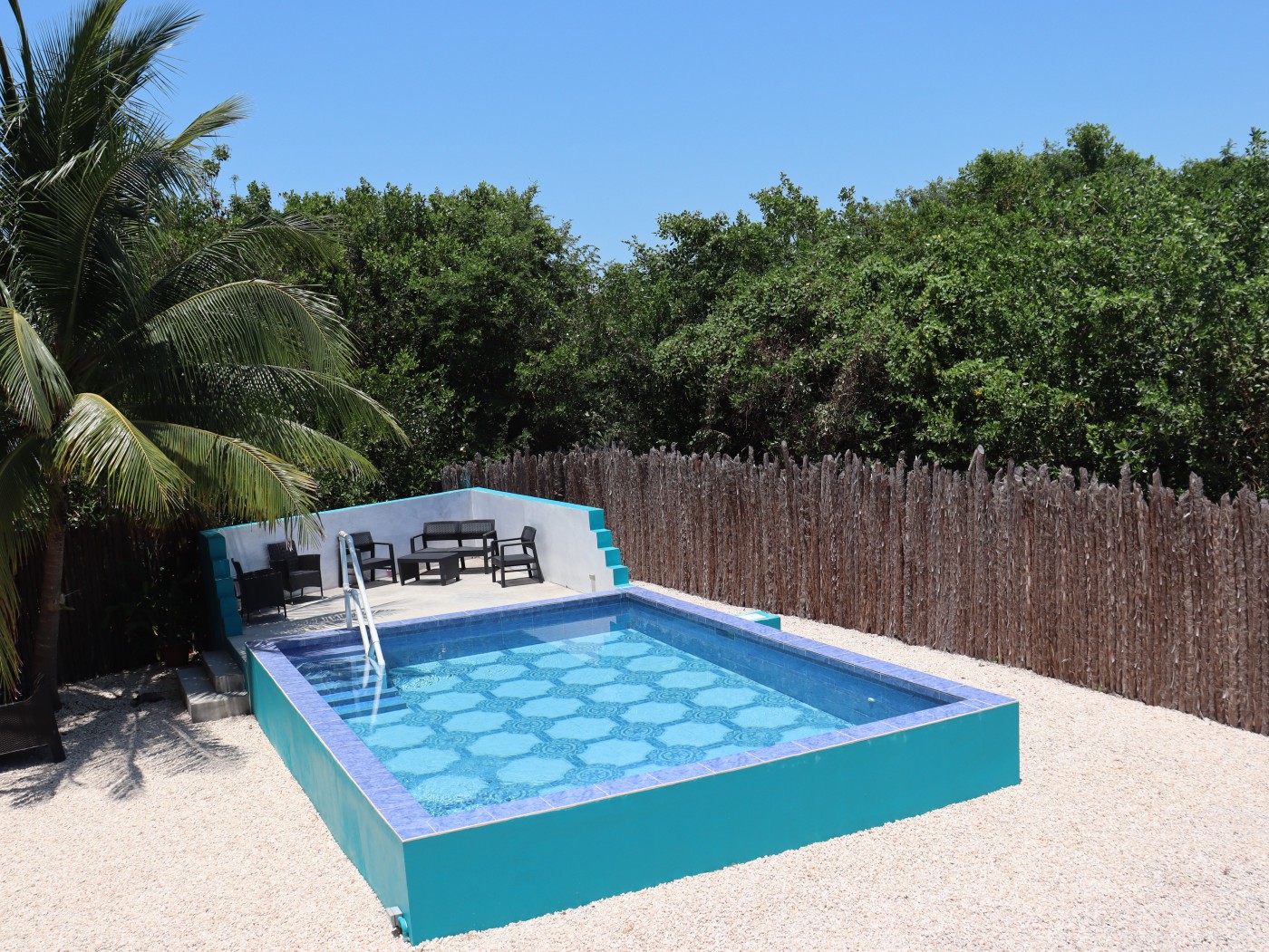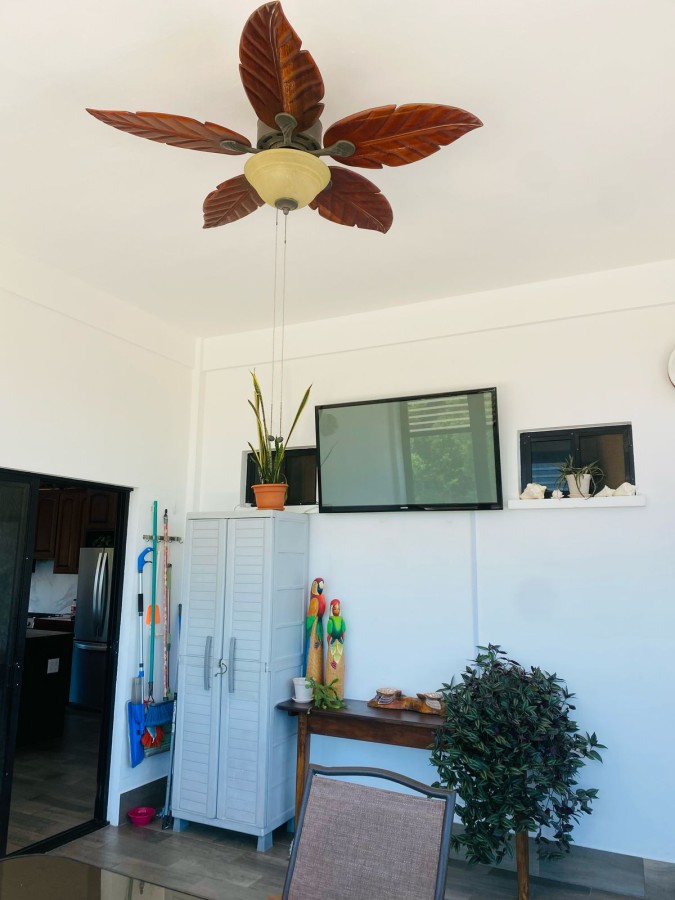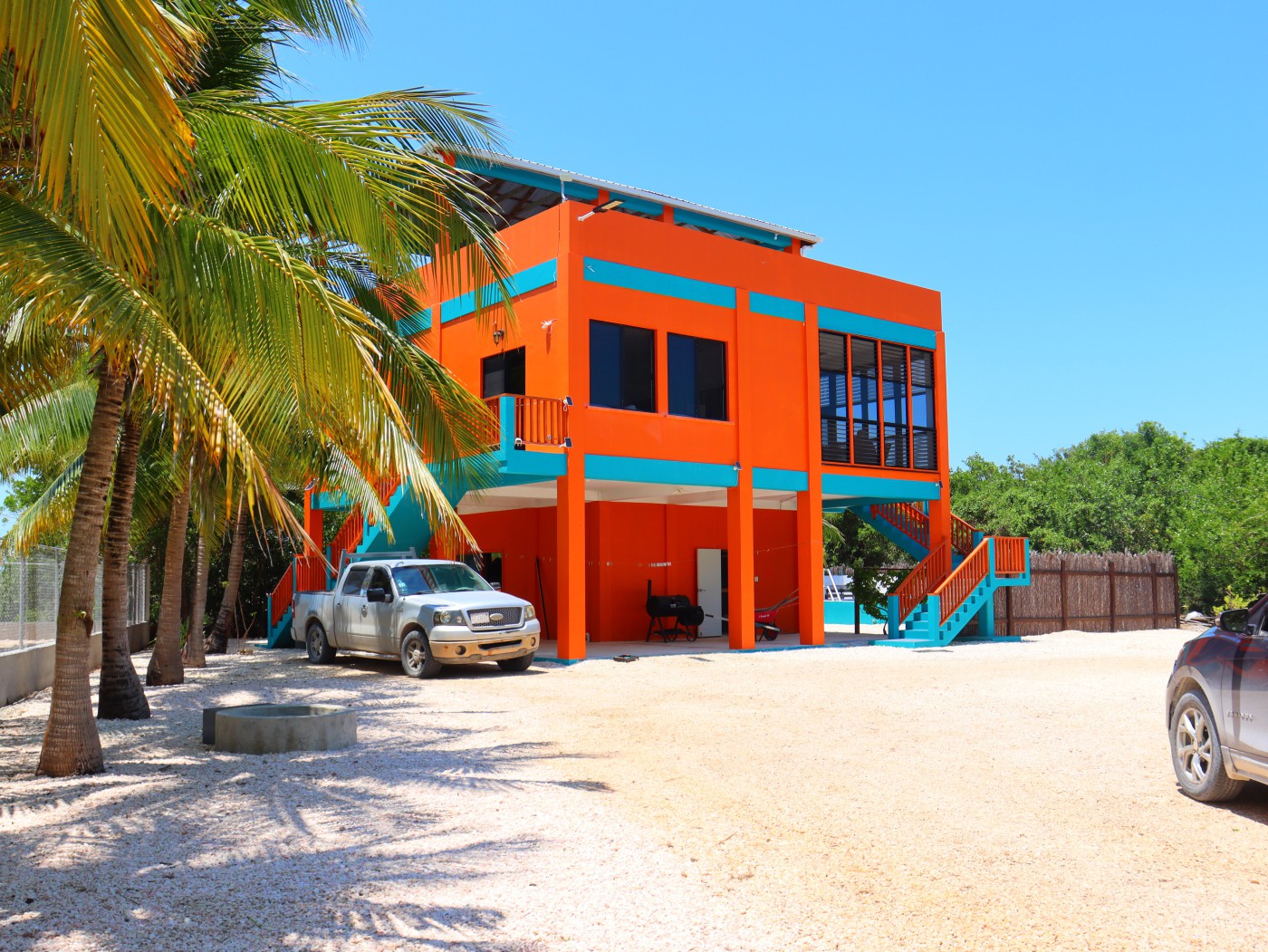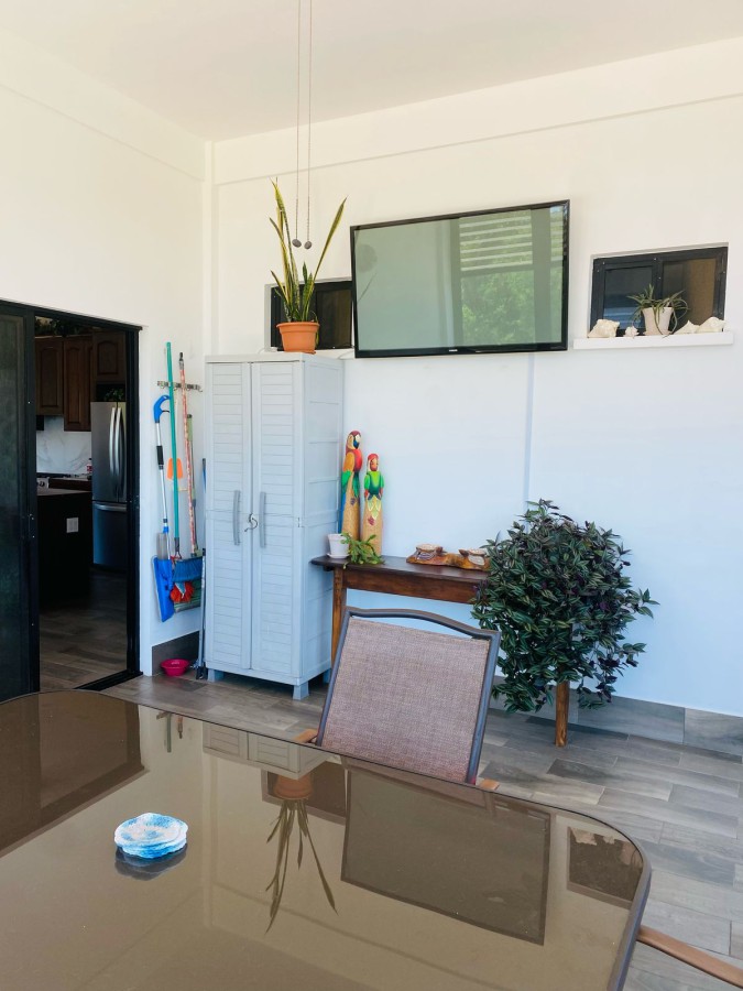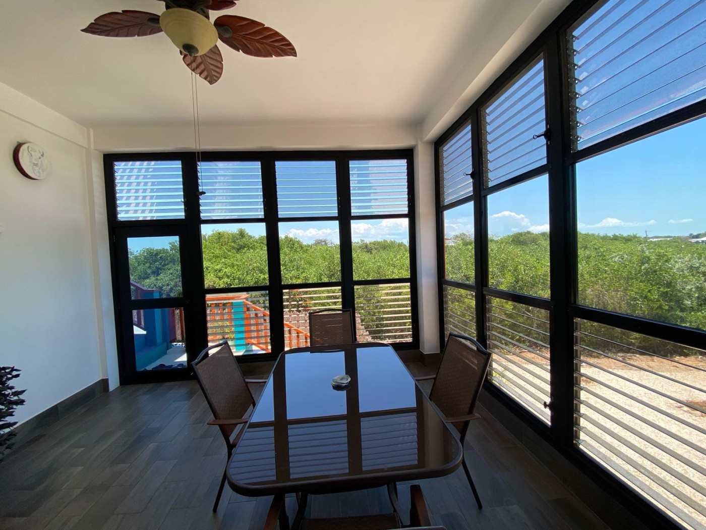 The heart of the home is undoubtedly the semi-furnished kitchen, adorned with exquisite Belizean exotic hardwood cabinets and an inviting island that beckons culinary enthusiasts. A linen closet conveniently sits nearby for added storage. Adjacent to the kitchen is a beautifully furnished bathroom that complements the modern aesthetic throughout.