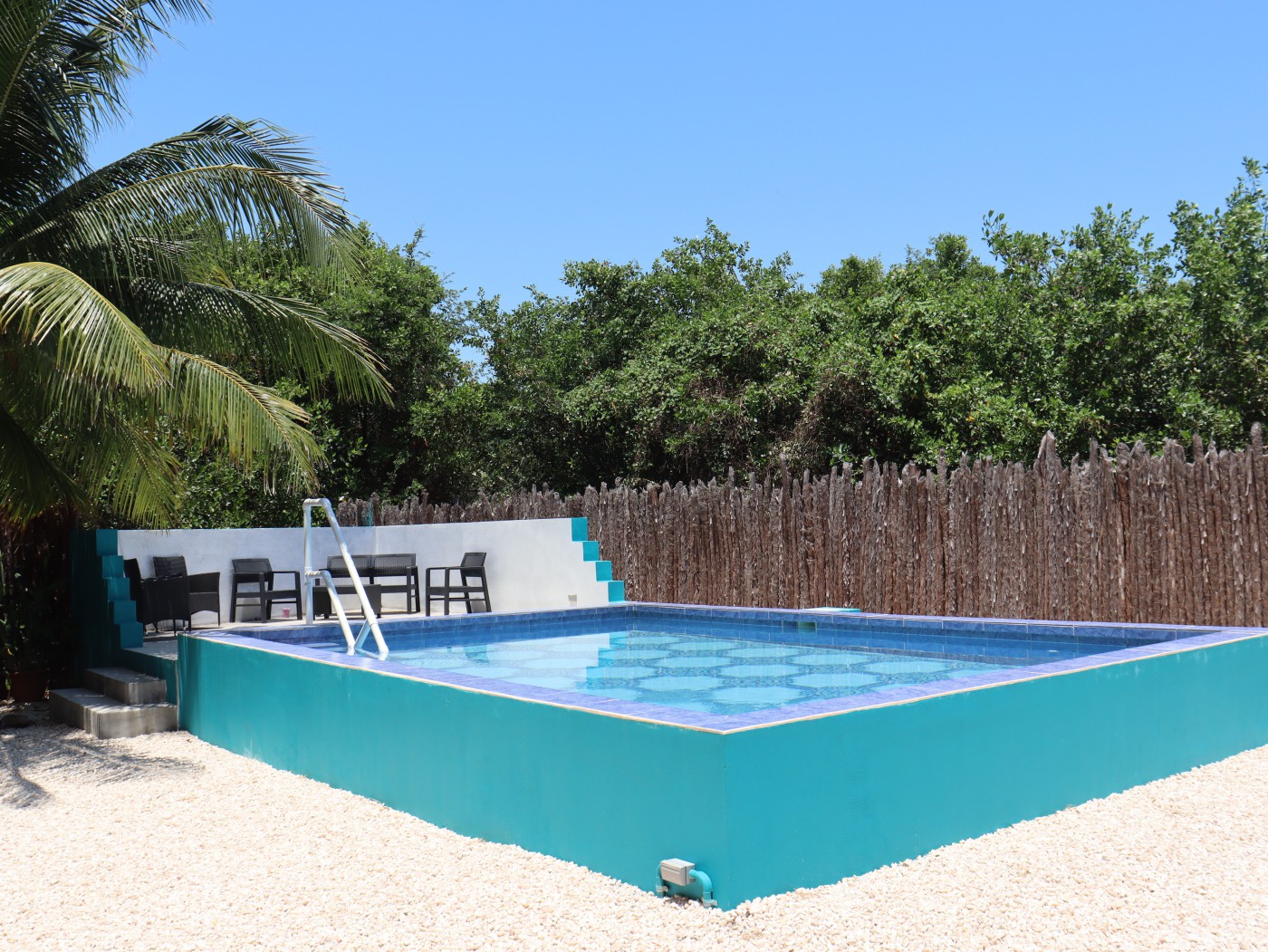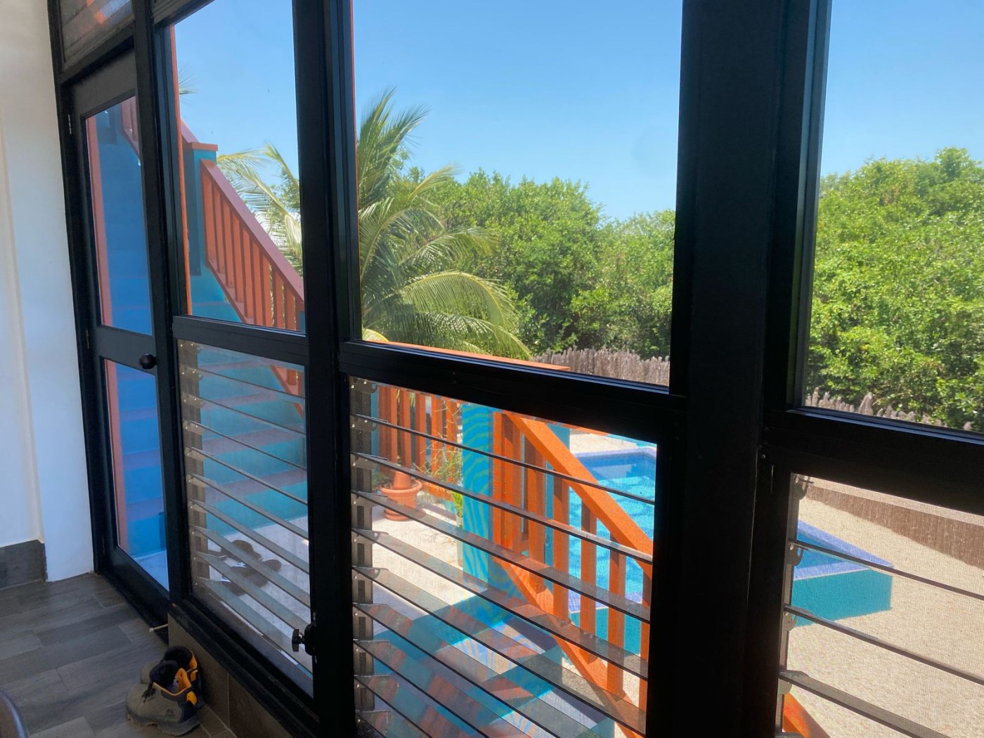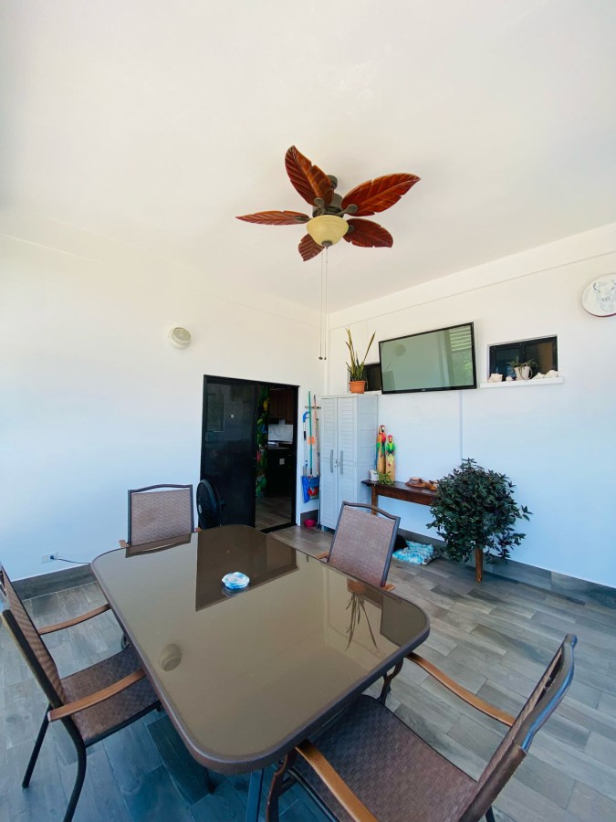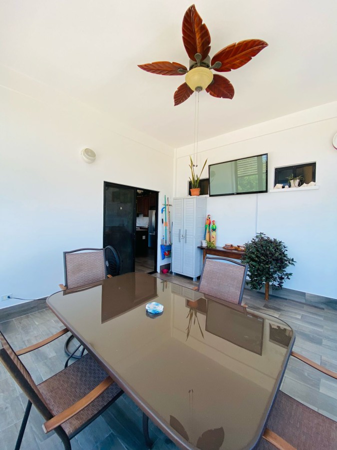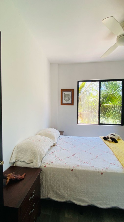 The heart of the home is undoubtedly the semi-furnished kitchen, adorned with exquisite Belizean exotic hardwood cabinets and an inviting island that beckons culinary enthusiasts. A linen closet conveniently sits nearby for added storage. Adjacent to the kitchen is a beautifully furnished bathroom that complements the modern aesthetic throughout.