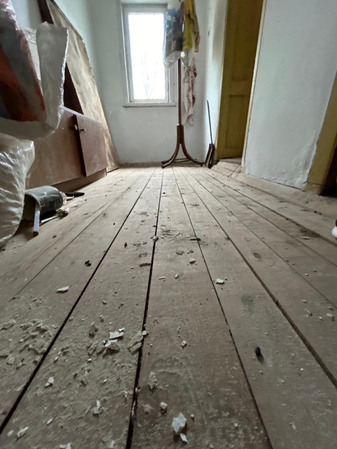 Auch diese Etage besteht aus Dielen und 2 der Räume wurden mit neuen Holzlatten verkleidet.