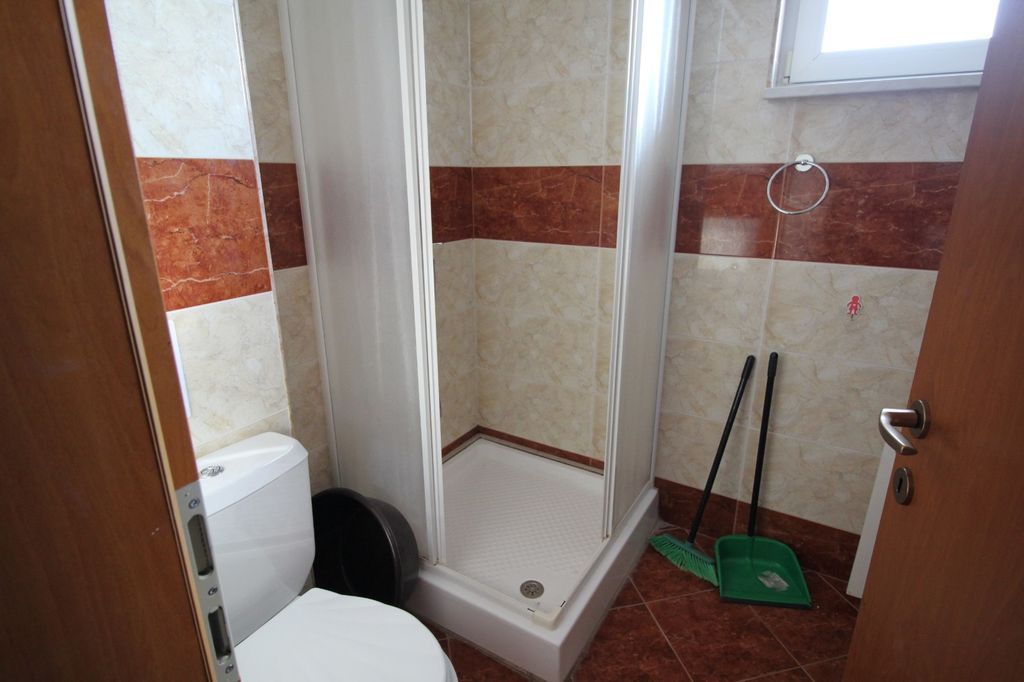 bathroom with toilet and shower cabin and a large a balcony with amazing sea