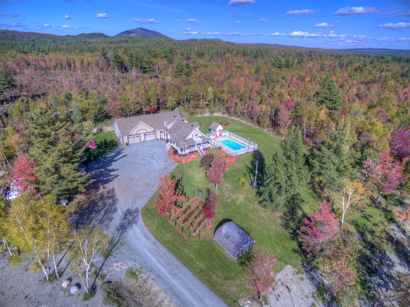 Property Overview: - 60 acres with private access roads - 6,700 sq ft home and attached garage - 4 bedrooms, multiple baths - Pool, greenhouse, barn, blueberry patch