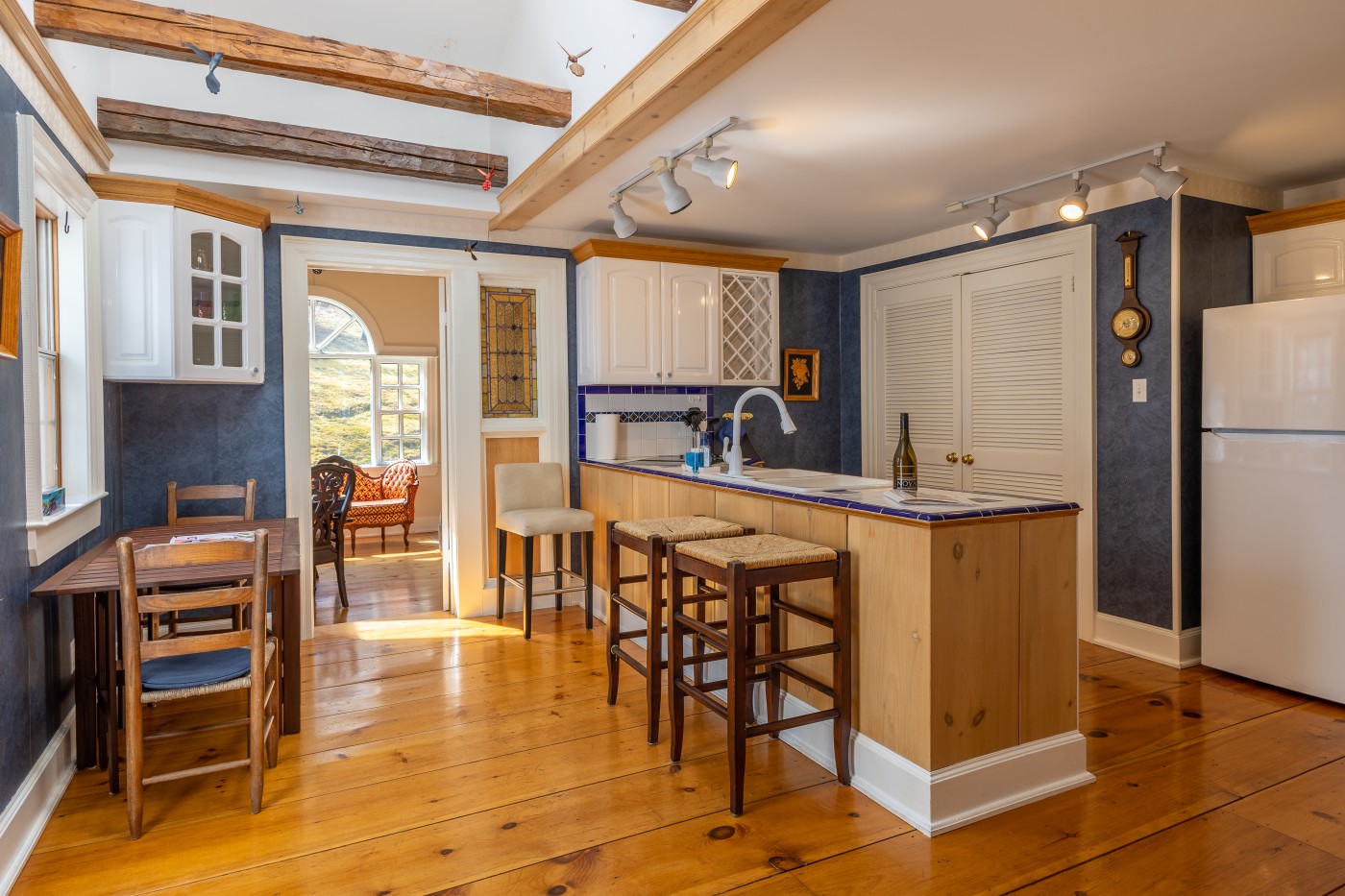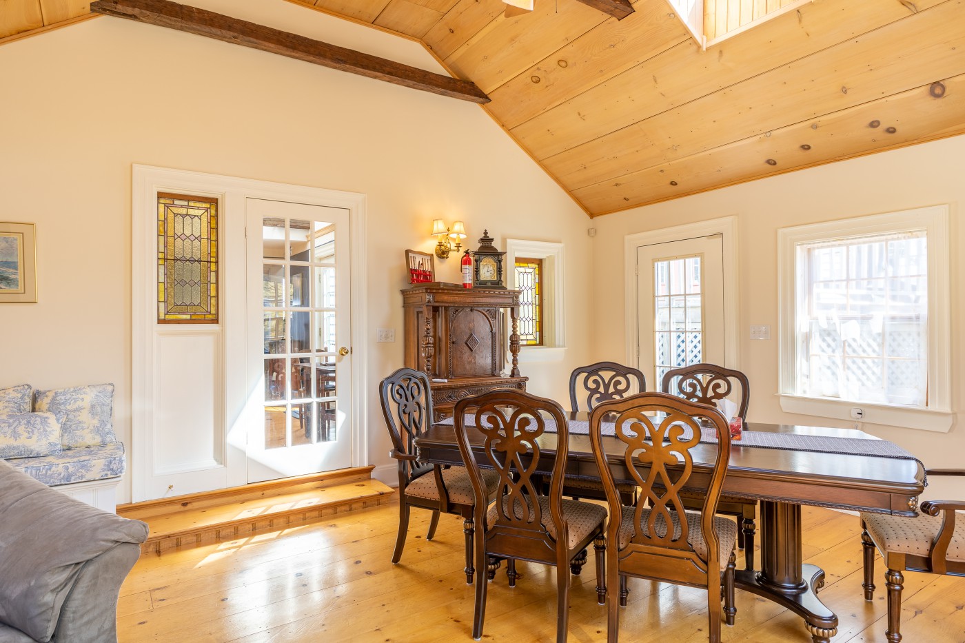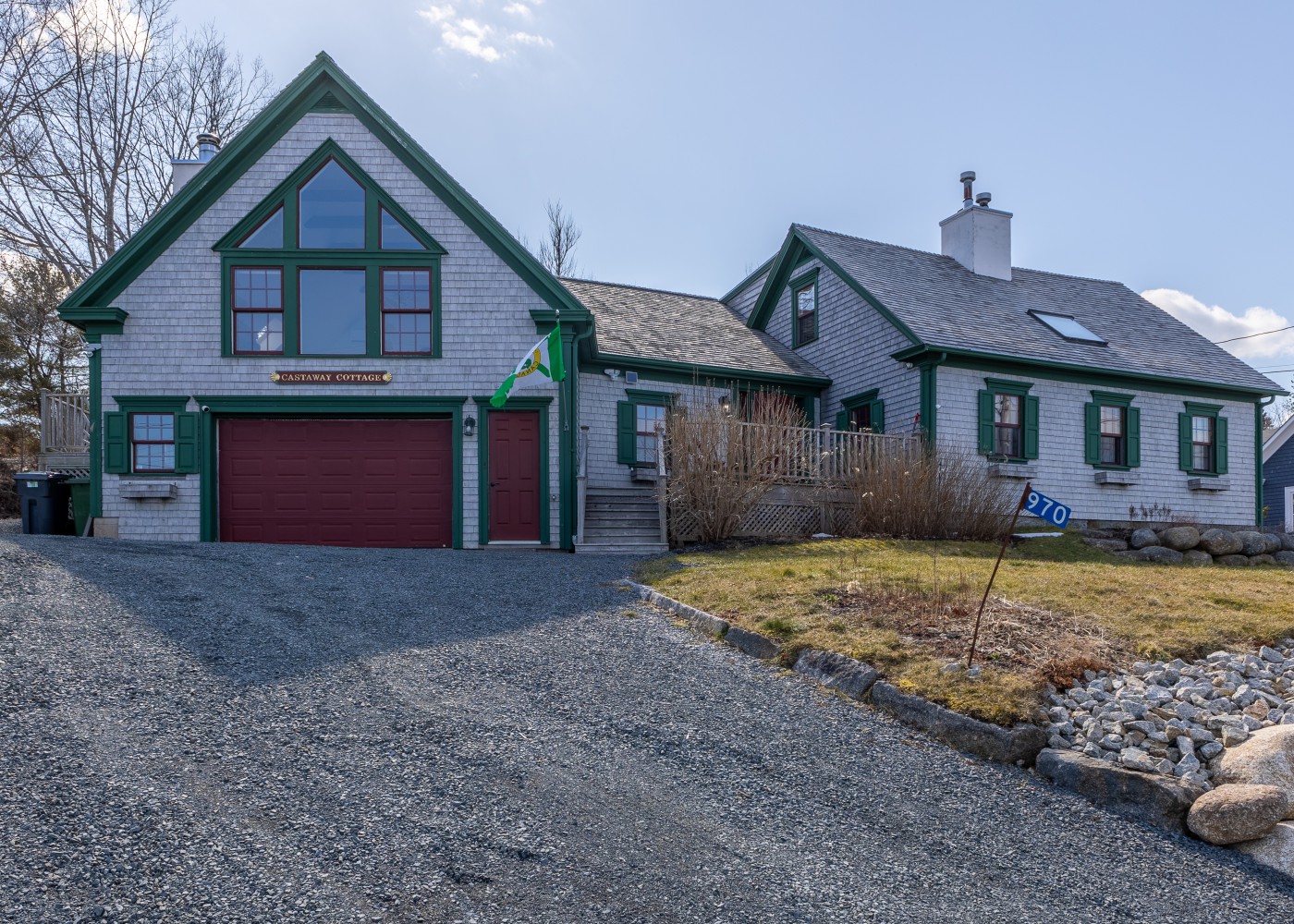 a 200 year old early settler’s homestead before the blue waters of beautiful Mahone Bay. The house consists of the original Cape, a newer great room addition at the rear, an adjacent attached double garage with family room in the loft, and a connecting front foyer acting as a breezeway between the garage and main body of the house. As one enters the front foyer, one is struck by the unusual angles and natural light sources with exposed beams and unexpected architectural detail. A staircase to the left, with its gentle rise, is incised with the inspirational words from Psalm 104:26 and leads through double French doors to a great room with this home’s, prime vantage point looking out to sea. Returning to the entry hall there is a water closet tucked discreetly to one side with a small closet opposite for hanging coats. As one enters the older body of the house there is a dining-room with gas fireplace to the front and a generous sized eat-in kitchen to the rear. Off the kitchen in the rear extension is a large living room bathed in western light. The principal bedroom suite is at the northeastern corner of the house with two generous sized closets and 5-piece bathroom. The personal bath also opens onto a small office/library space which has an alternate door to the living-room at the rear. The upstairs consists of two bedrooms off a central hall leading to a shared family bath. From the front bedroom in the eaves, one enters a diminutive mezzanine reading corner which looks out through a skylight to the bay. This home has exceptional millwork, all in solid wood displaying superior craftmanship. Most floors are wide pine plank, and this design in its uniqueness is unlike anything in the country. The home has lovely water views and a warm welcoming spirit.