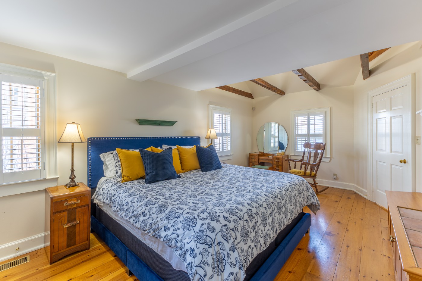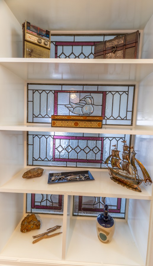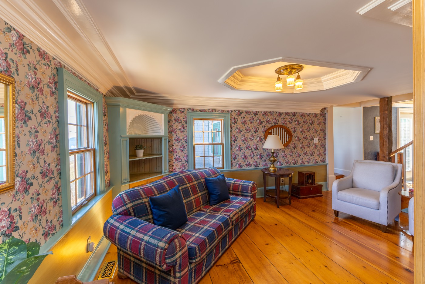a 200 year old early settler’s homestead before the blue waters of beautiful Mahone Bay. The house consists of the original Cape, a newer great room addition at the rear, an adjacent attached double garage with family room in the loft, and a connecting front foyer acting as a breezeway between the garage and main body of the house. As one enters the front foyer, one is struck by the unusual angles and natural light sources with exposed beams and unexpected architectural detail. A staircase to the left, with its gentle rise, is incised with the inspirational words from Psalm 104:26 and leads through double French doors to a great room with this home’s, prime vantage point looking out to sea. Returning to the entry hall there is a water closet tucked discreetly to one side with a small closet opposite for hanging coats. As one enters the older body of the house there is a dining-room with gas fireplace to the front and a generous sized eat-in kitchen to the rear. Off the kitchen in the rear extension is a large living room bathed in western light. The principal bedroom suite is at the northeastern corner of the house with two generous sized closets and 5-piece bathroom. The personal bath also opens onto a small office/library space which has an alternate door to the living-room at the rear. The upstairs consists of two bedrooms off a central hall leading to a shared family bath. From the front bedroom in the eaves, one enters a diminutive mezzanine reading corner which looks out through a skylight to the bay. This home has exceptional millwork, all in solid wood displaying superior craftmanship. Most floors are wide pine plank, and this design in its uniqueness is unlike anything in the country. The home has lovely water views and a warm welcoming spirit.