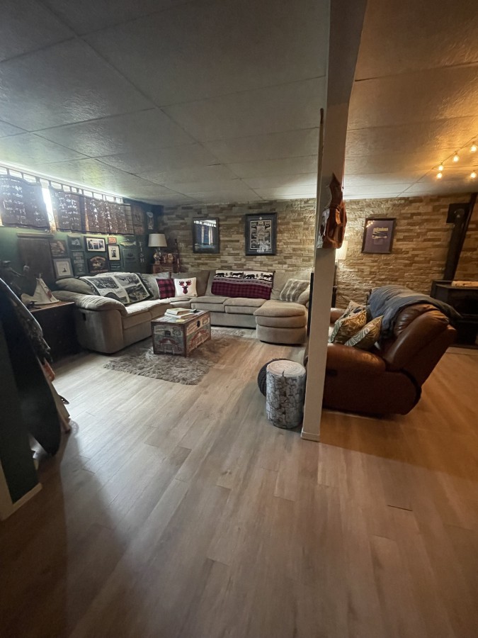Completely finished basement, large laundry/storage room, bar, rec room, bedroom and office.