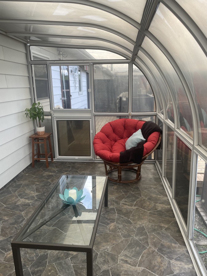 Fenced in backyard with green house, large storage shed with light and cozy screened in gazebo