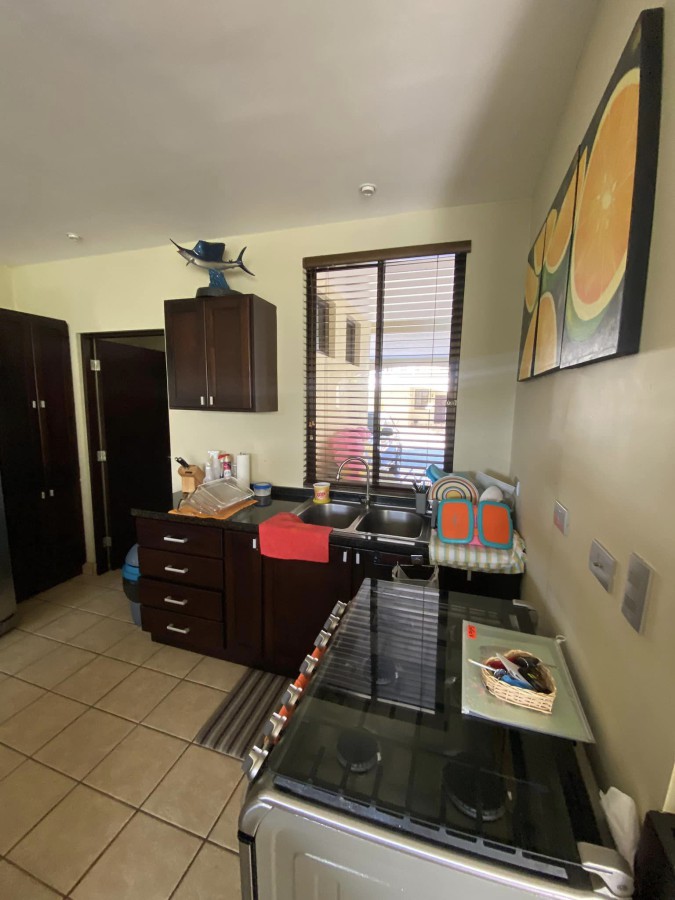countertops and hardwood cabinets, a living and dining area, a terrace and backyard, half