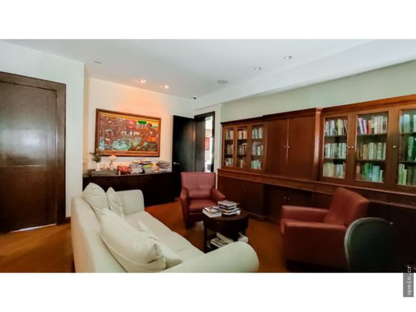 each with its own bathroom, as well as a guest bathroom, library, office, TV room, Bar and two parking