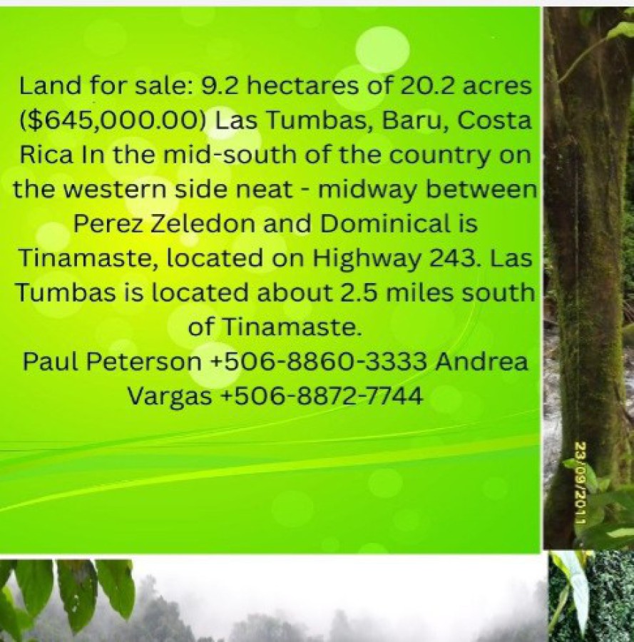 This beautiful property in Las Tumbas, Baru, offers 9.2 hectares (20.2 acres) of secluded land surrounded by nature. Located in the mid-south of Costa Rica, it is conveniently positioned about halfway between Dominical and Perez Zeledon, just 2.5 miles south of Tinamaste along Highway 243.