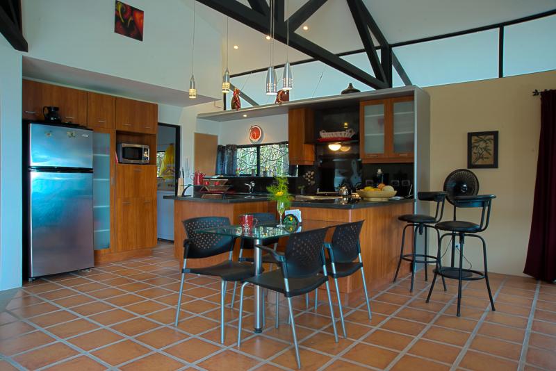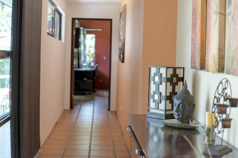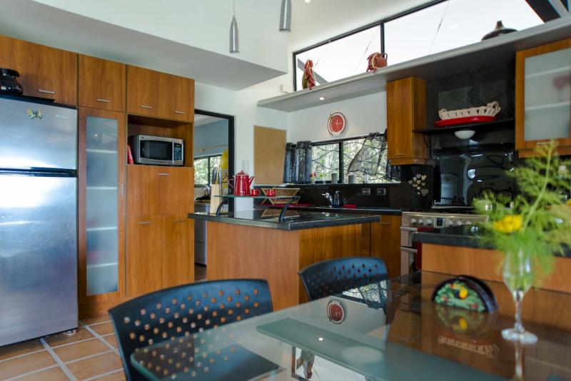 CASA ALMA is located in the highlands of Escazú, in a small and exclusive gated community. CASA ALMA is a wonderful creation of the reknown architect Manfred Barboza and the designer Silke Shoer, who have vast experience in designing upscale residences and commercial projects in the United States. The house has a tropical inside-outside design. The outside areas and the view play a mayor roll as they are incorporated to the social areas of the house. The house opens up through 2 large sliding doors that incorporate the outside and the beautiful front yard. The high ceilings are a practical way to keep the house cool and allow the fresh air to circulate freely in and out. The large terrace is a beautiful place to relax and enjoy the beauty of this unique house. Because of its unique and practical design CASA ALMA has been featured twice in the reknown architect magazine SuCasa.