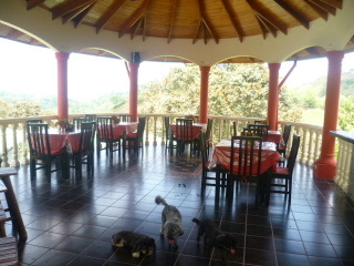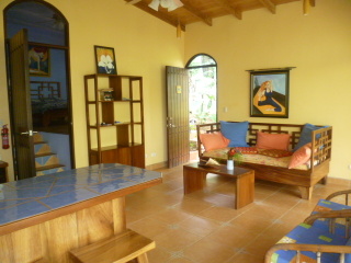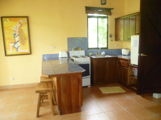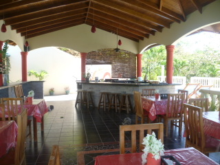 • A covered all tiled outdoor dining area with full kitchen (rancho), two sinks, 3 fridges, gas barbeque, long bar with stools, 5 tables and chairs (currently seats 28), overlooking garden and jungle with distant view of the Pacific Ocean.
