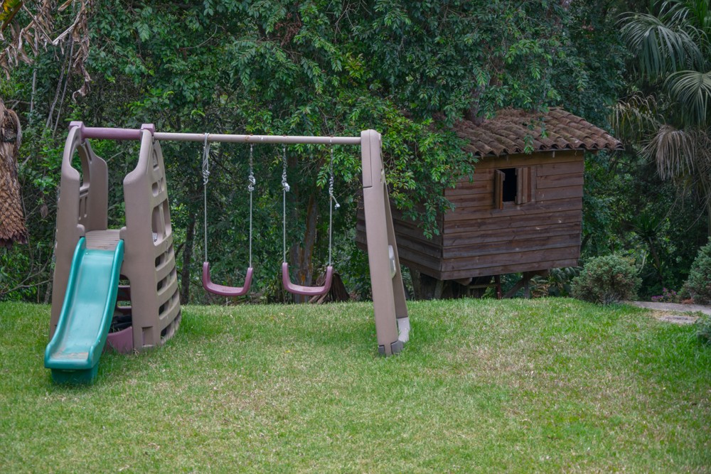 Custom tree house surrounded by many old growth trees & Playground for children.
