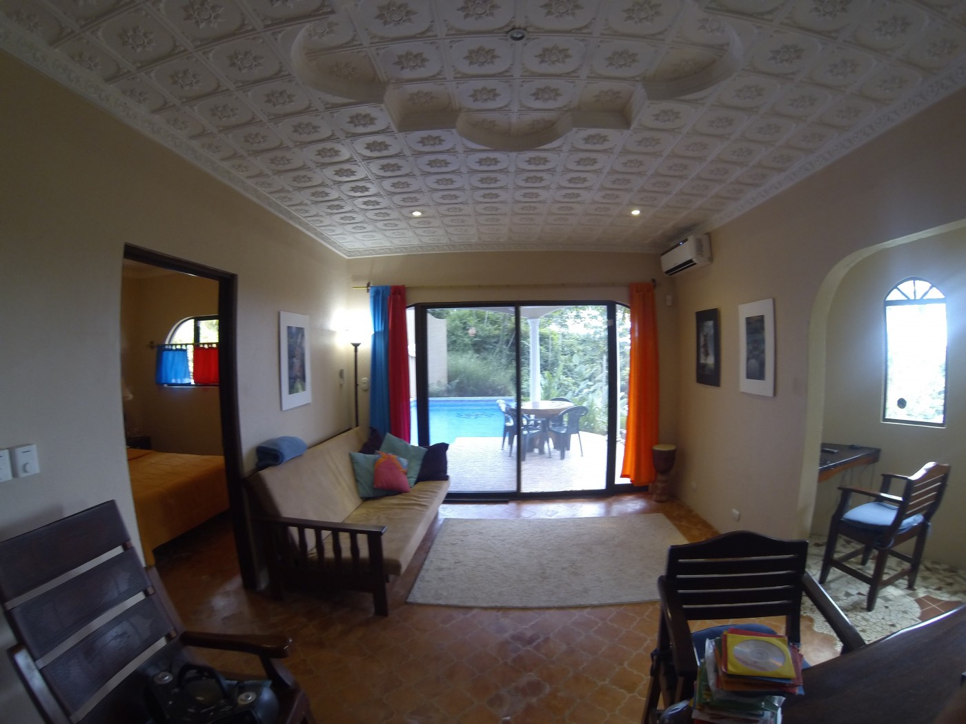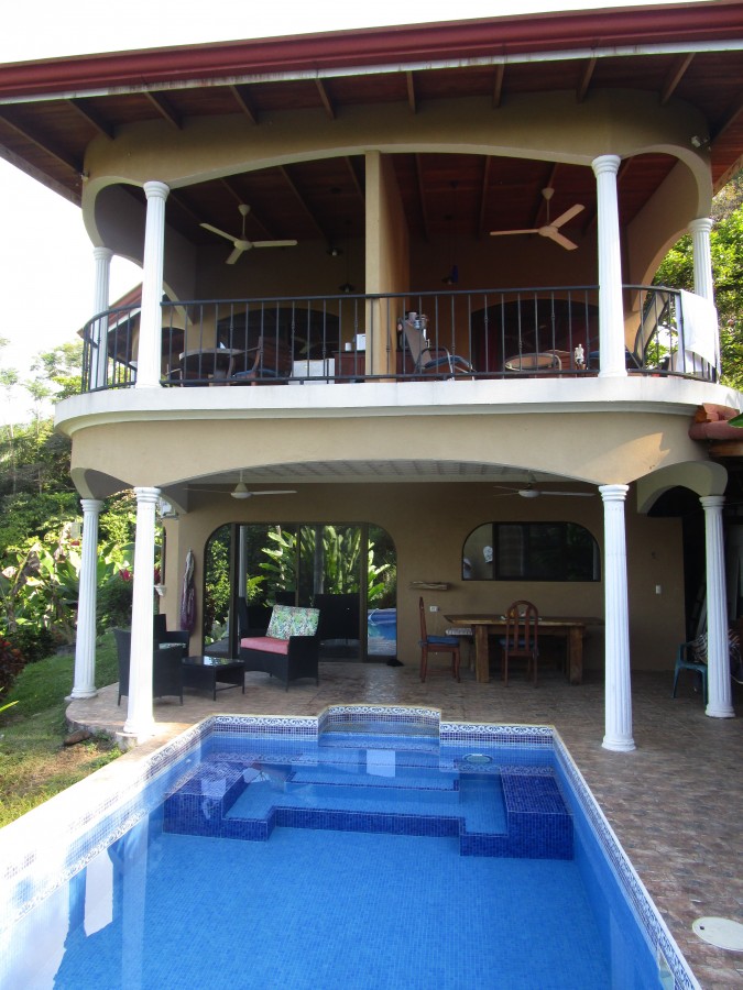 Private Gated Estate 6835 sq meters on the most desirable road in Ojochal. Fantastic Pacific Ocean Sunset view home for sale. Fully Tiled swimming pool. 2 one bedroom studio apartments up one bedroom down. 3 bathrooms 2 kitchenettes up and one indoor kitchen down and a poolside patio grill area. One minute from the coast highway. Public water, cable tica internet, Fully tiled swimming pool. Fully grown gardens includes Avocado, momochino, Bananas, Carambolas, papayas, Palms, pineapples. 2 car carport, full laundry.