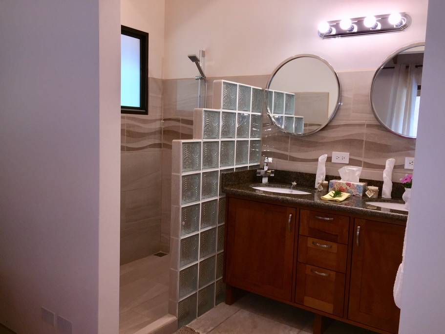 This home, built on an oversized 1/3 acre lot, was meticulously designed and constructed to North American standards. The floor plan flows smoothly. The centerpiece is a large granite kitchen with custom tropical hardwood cabinets. Adjacent to the large kitchen is the living room which has direct access to the outdoor deck and infinity edge swimming pool. There is a stand alone 360 foot square terrace with pergola area for covered outdoor dining or sun worshiping which is directly over the two car carport. Each bedroom has its own large ensuite bath. Two of the bedrooms enjoy private terraces.