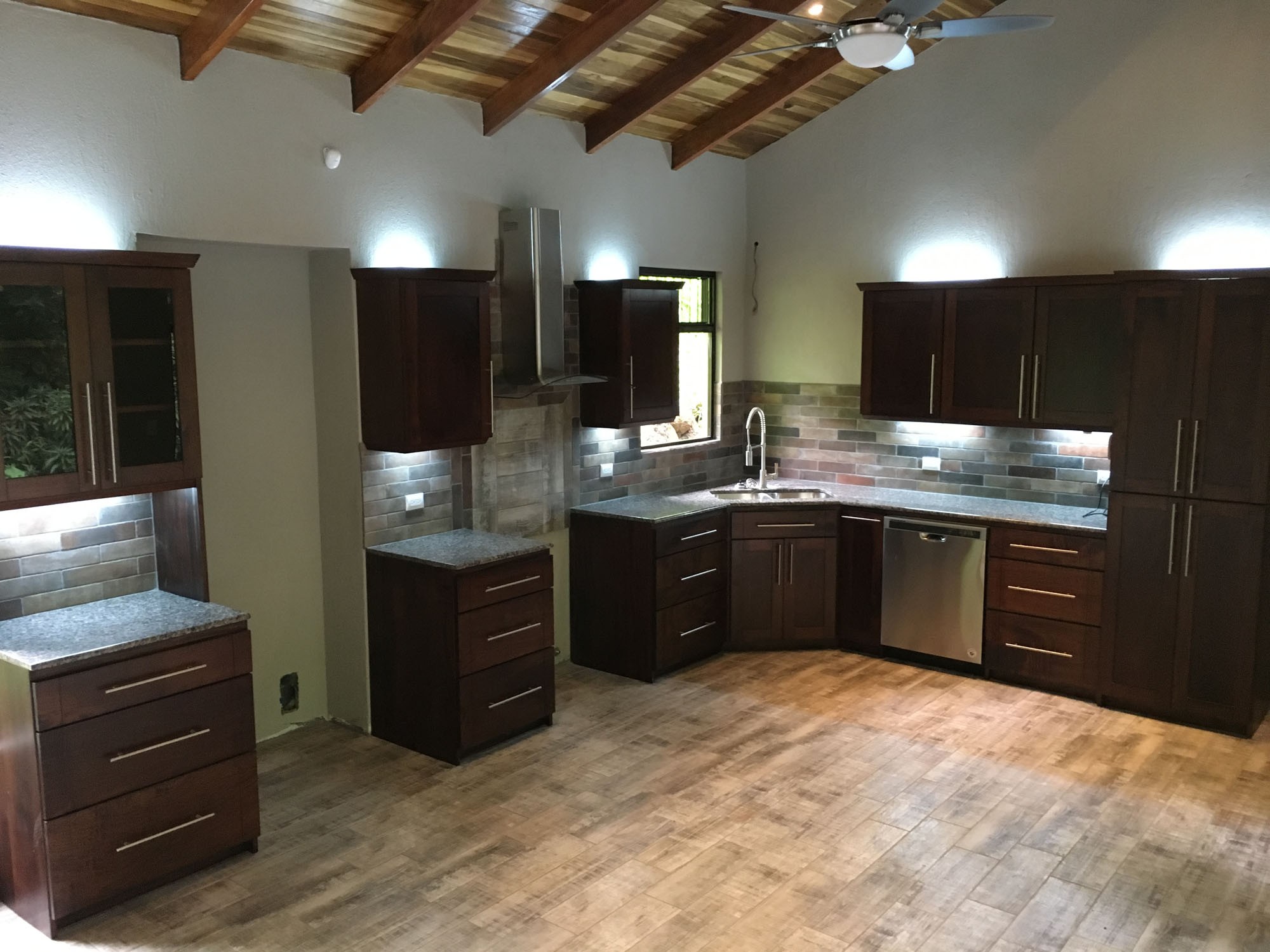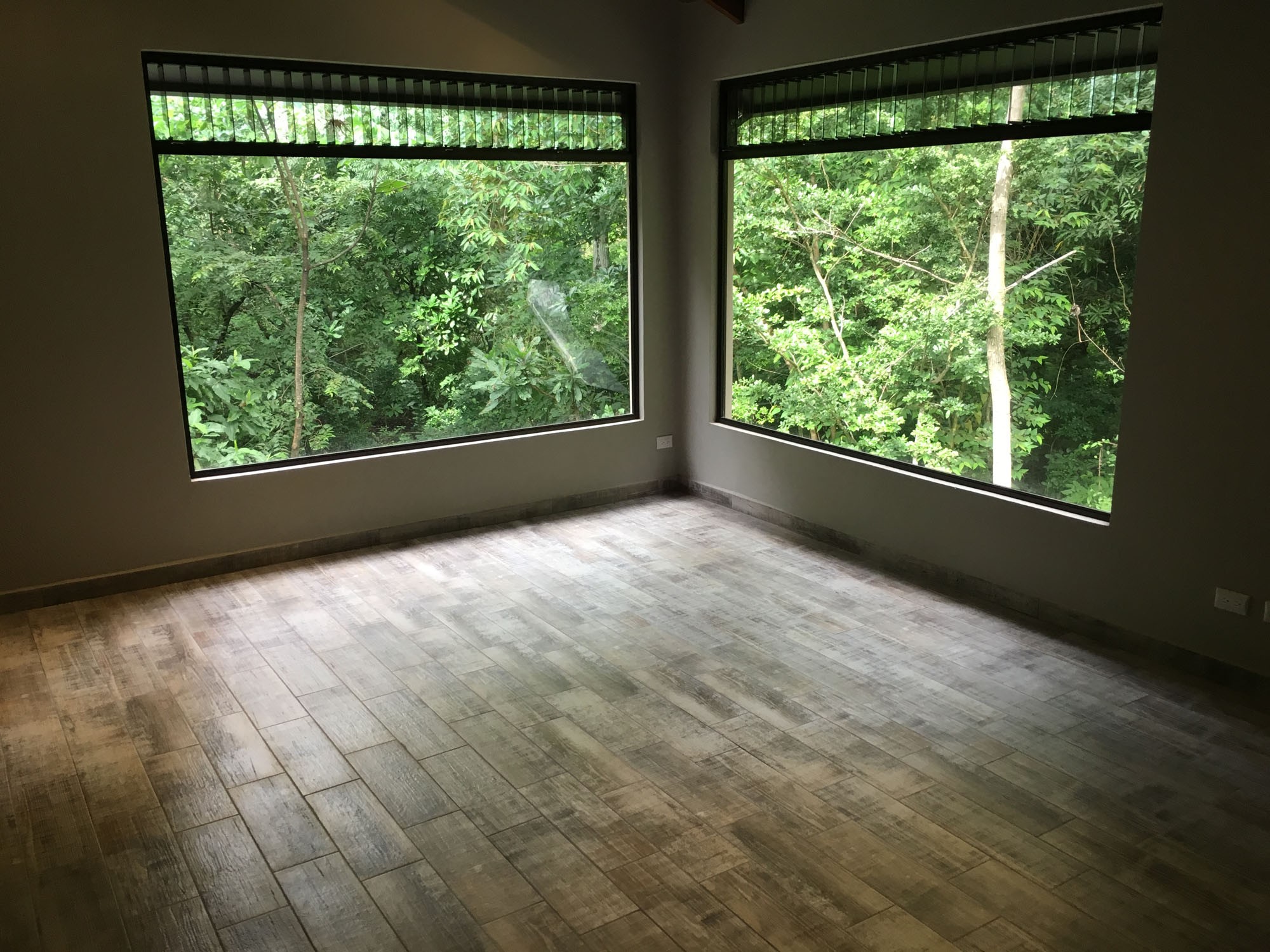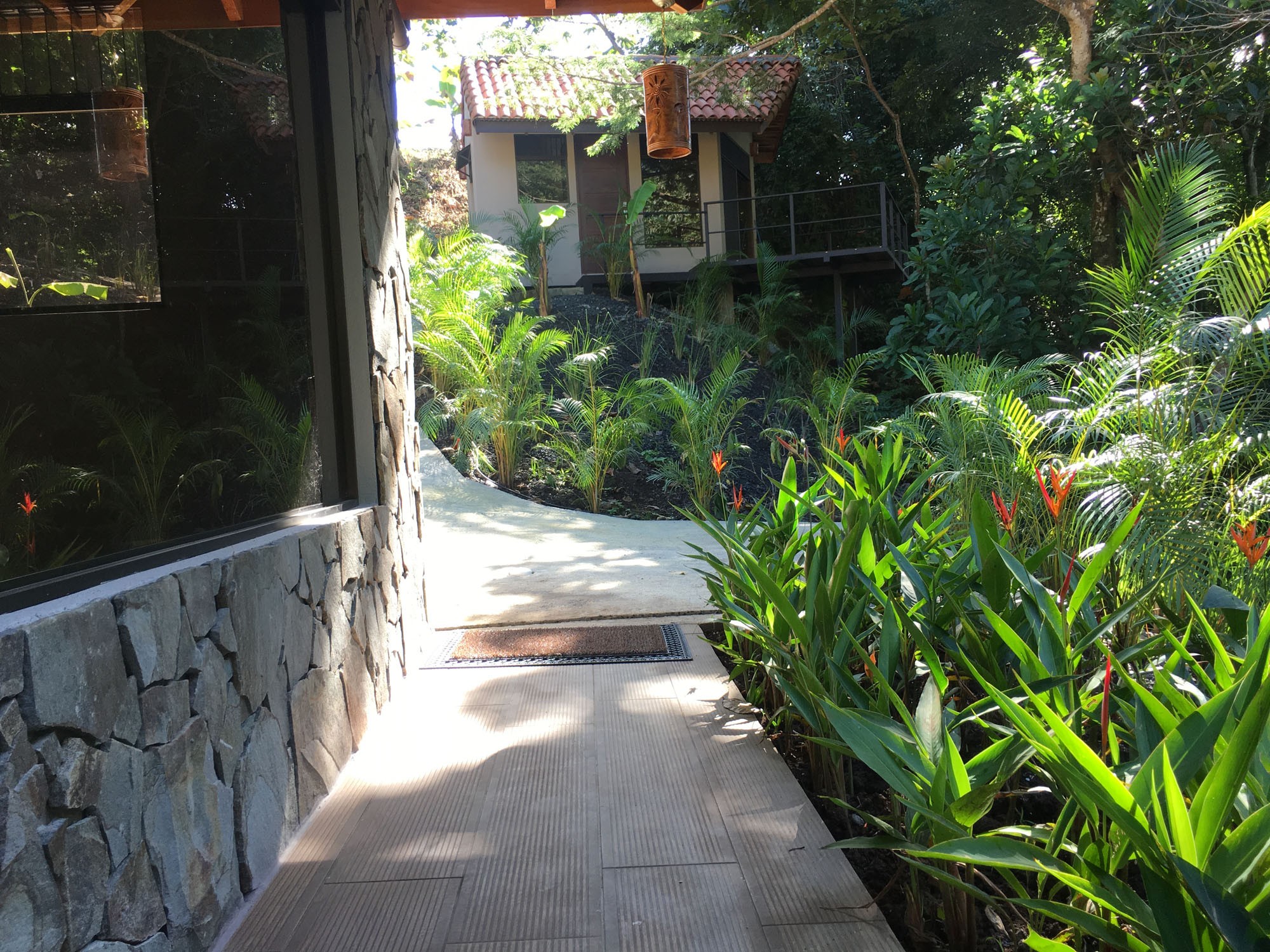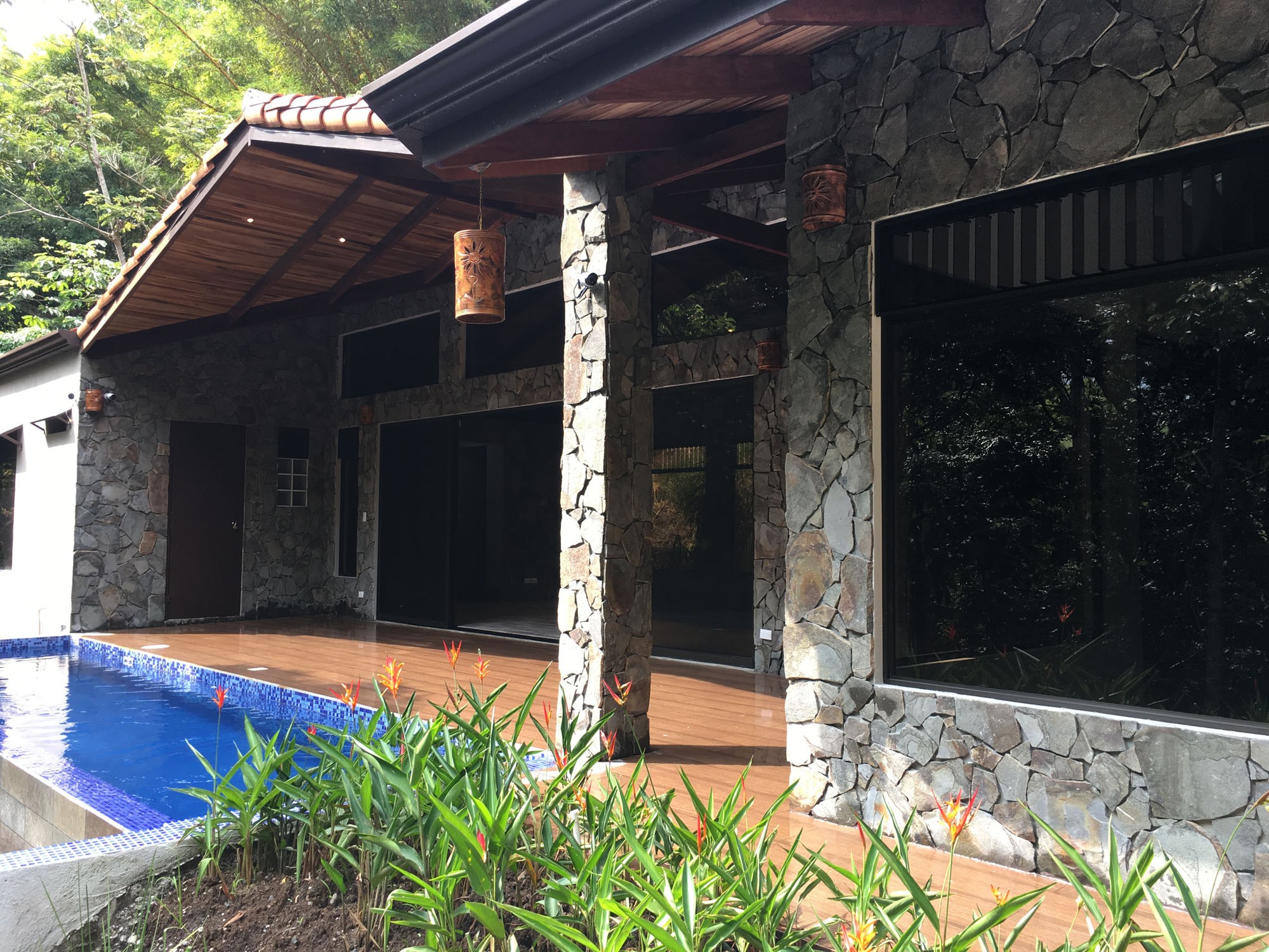 The “ADIRONDACK” is a Luxury House with a Guesthouse, combined size of 2196 ft2 (204 m2) and has been specifically designed for lot 4. The view, privacy, and accessibility have all been taken into consideration. The house has a height of 15 ft. All ceilings are finished with gorgeous tongue and groove wood. The sliding doors in the living room allow you to open up the house creating an amazing outdoor feel, even inside. The doors lead out to the covered patio area that is privatized by the shape of the building. The infinity pool is the focal point. This 2 bedroom, 3 bath, luxury home which includes a separate Guesthouse with a 3rd bedroom and 4th bath, is sure to please. The master bedroom has an ensuite washroom. The living room/kitchen look directly at the pool and the jungle view! The kitchen cupboards and all doors are custom, hand-made from Cedro (Spanish cedar) wood. Again, “ADIRONDACK” is HIGH QUALITY CONSTRUCTION. The roof is clay tile with another metal roof underneath. This is the best type of roof to have in Costa Rica (reduces the noise of the rain, helps to insulate from the sun) and is one of the most expensive. All material used to construct this home will be of the highest quality. “ADIRONDACK” has an alarm system and security cameras that can be controlled and viewed from your smartphone! Plus an inground irrigation system!