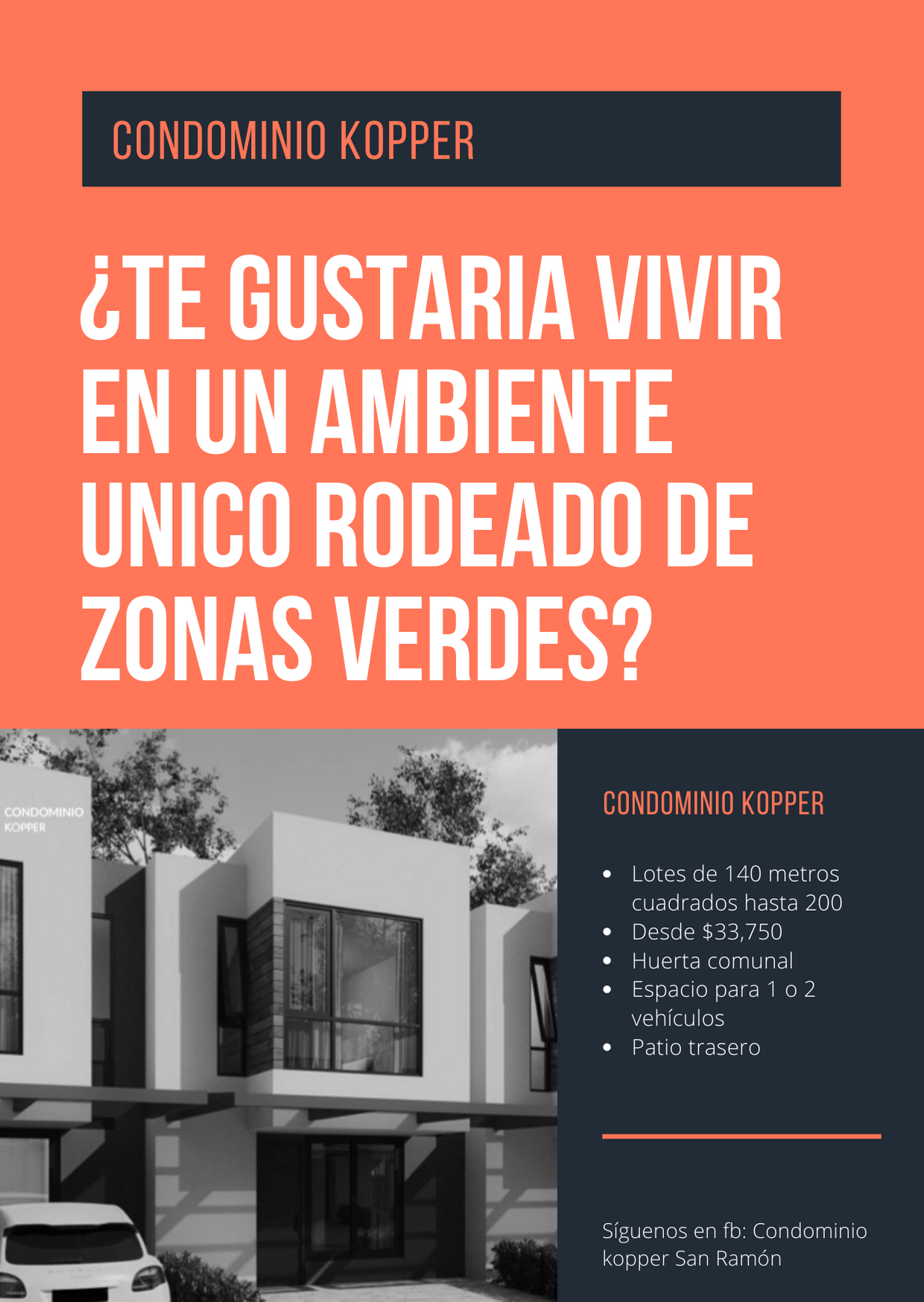 š Would you like to live in a unique condominium, friendly to the environment, surrounded by peace, green areas, with a communal garden, children`s games, outdoor exercise in other benefits? Houses from 1 to 3 bedrooms in the beautiful canton of San RamoĢn from US $ 33,750 with space for 2 vehicles and backyard Condominio Kopper San RamoĢn