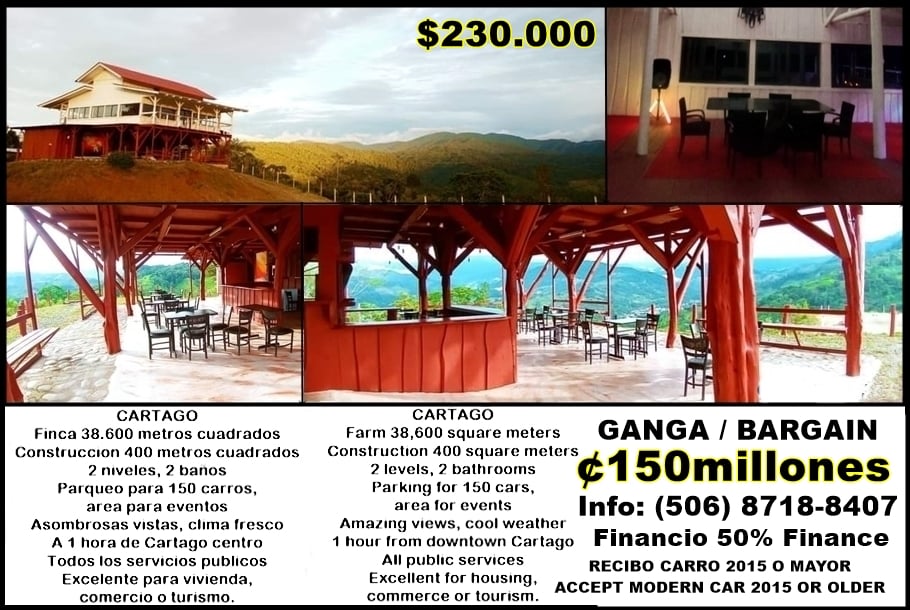 FOR SALE BEAUTIFUL RECREATION PROPERTY OR TOURIST CENTER OF 38,600M2, IN TUCURRIQUE CARTAGO. BEAUTIFUL PANORAMIC LANDSCAPES, COOL WEATHER, LOTS OF NATURE. 2015 OR OLDER VEHICLE IS RECEIVED 50% IS FINANCED. SPECIAL CASH PRICE. VALUE ₡150,000,000 / $230,000