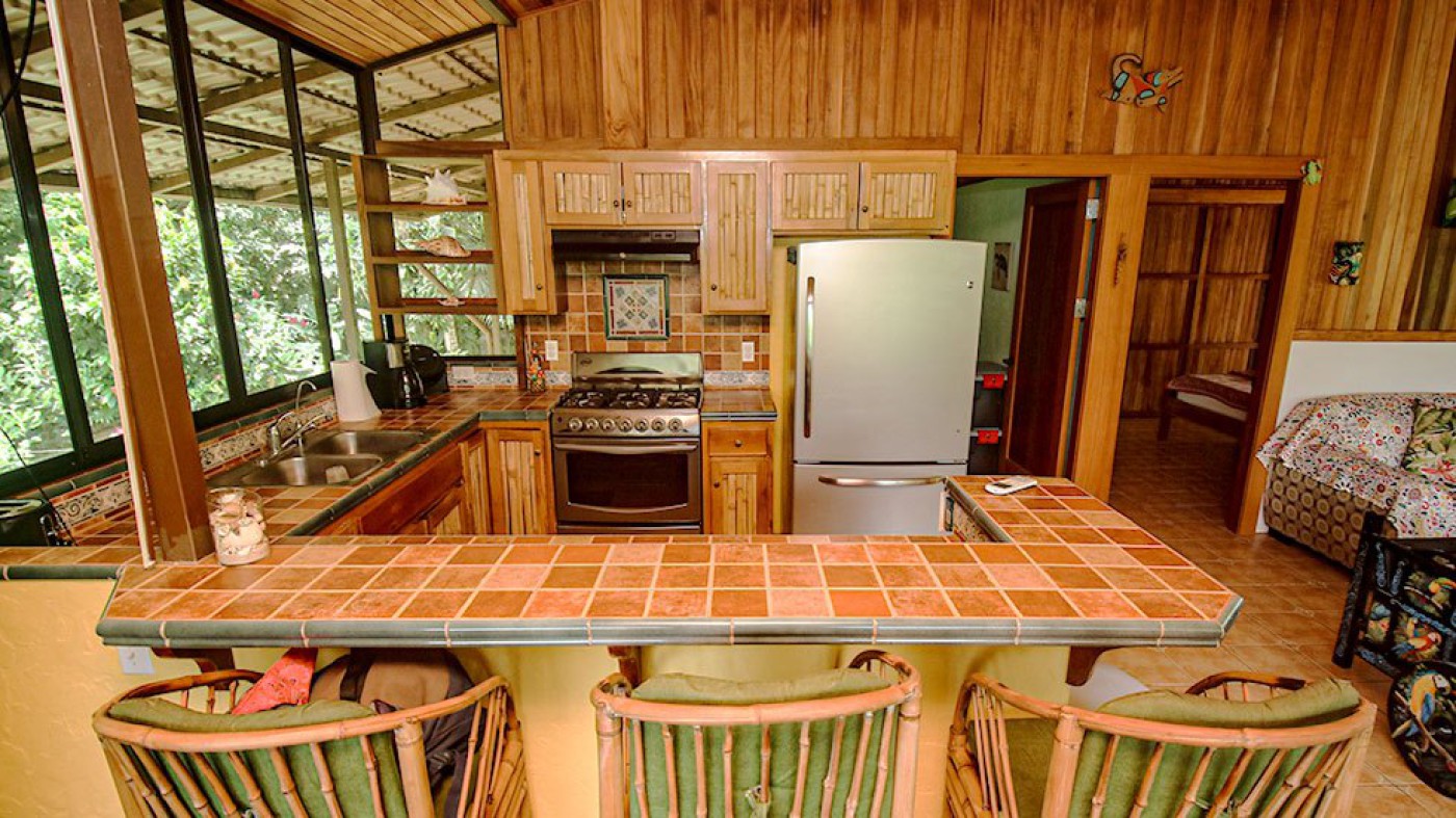 The living room is spacious, with high end A/C unit, and access to the teak covered deck. The kitchen and living room have wonderful natural lighting from all the windows, which makes spotting wildlife easy. The house is 1350sqft with an additional 390sqft on the deck.