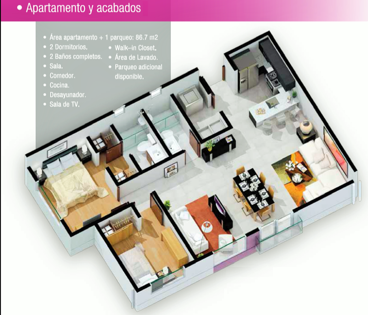 •Ãrea apartamento 73 m2 + 2 parqueos de 13,5 m2 cada uno (uno de ellos bajo techo)
