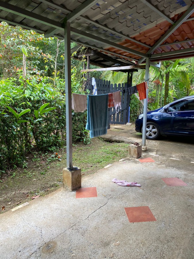Tiene una casa de madera y perlin (172 m2), sencilla, dos cuartos, baño, sala, comedor, cocina, garaje, corredor trasero.