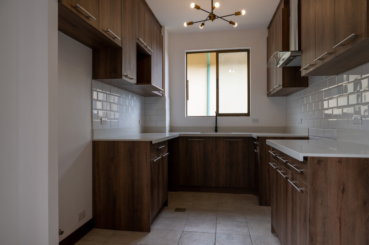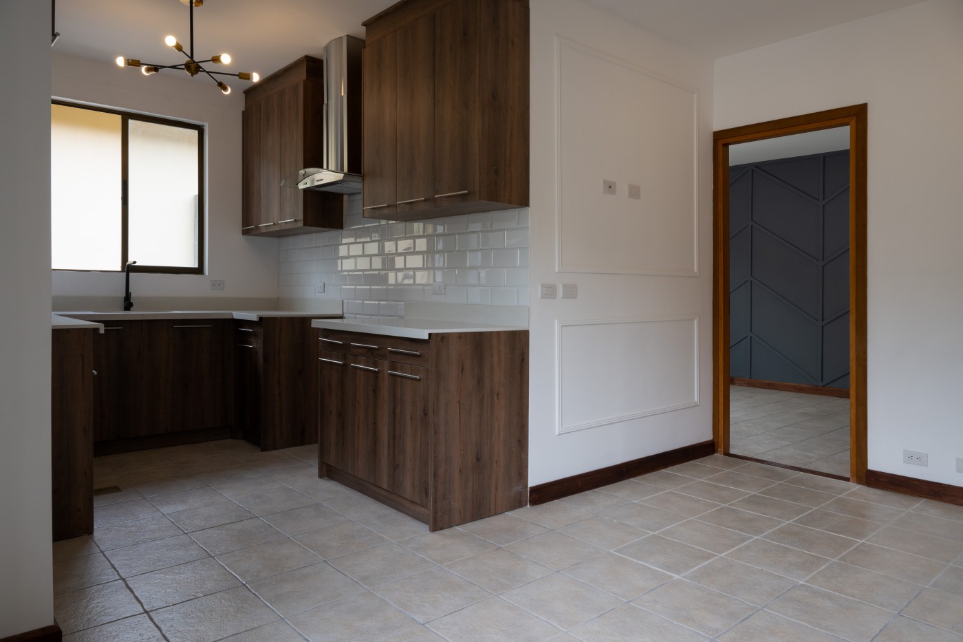 Cocina con sobre de cuarzo, molduras y modernas lámparas,