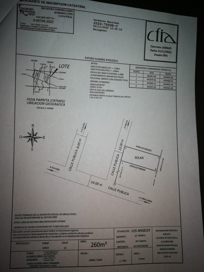 Se vende hermoso lote de 260 mts totalmente plano y listo para construir se encuentra en los ángeles en parrita de la costanera son 800mts cerca del centro de parrita donde encuentra bancos, farmacias, supermercados, etc. Cerca de playa bandera y palo seco, ya tiene disponibilidad de agua y luz y estudio de suelos