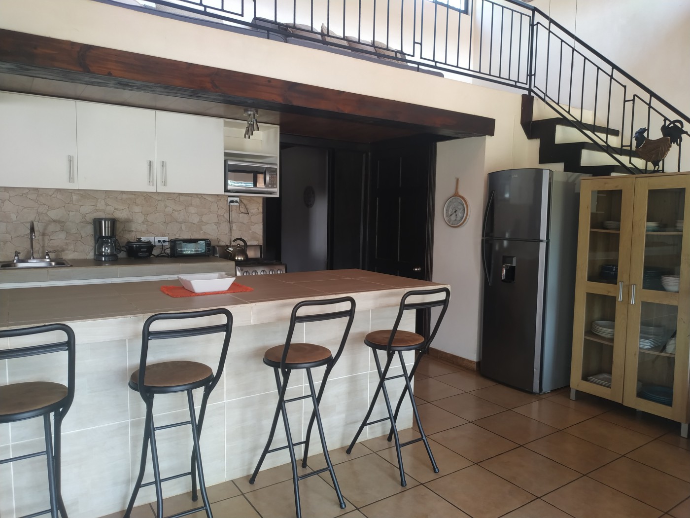 front of the kitchen and the living