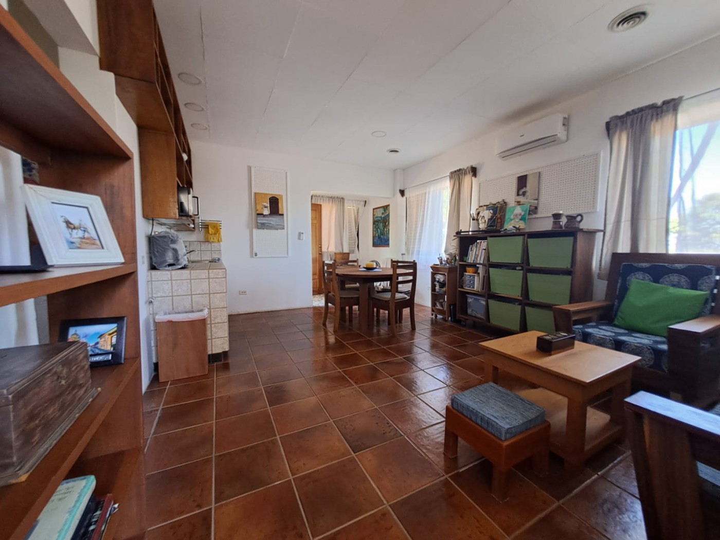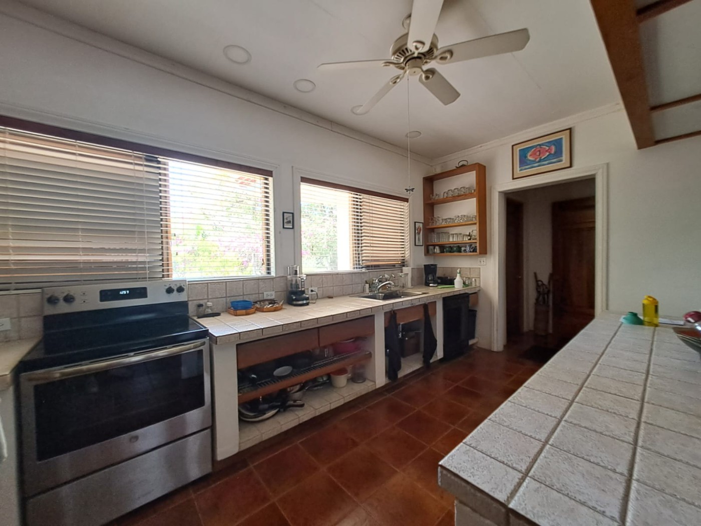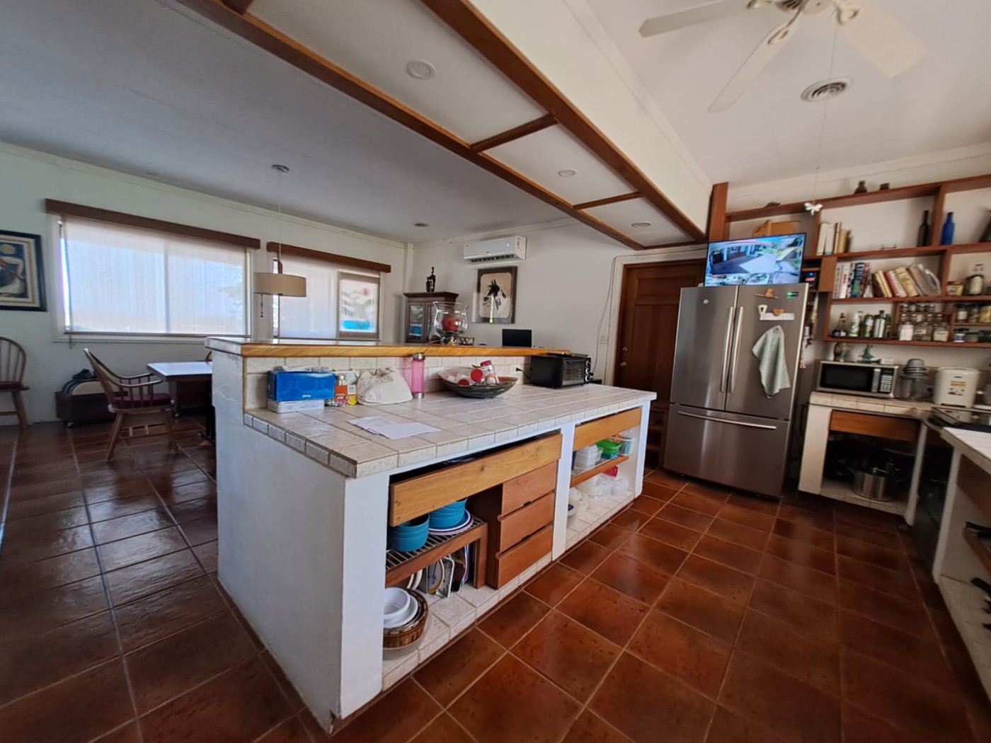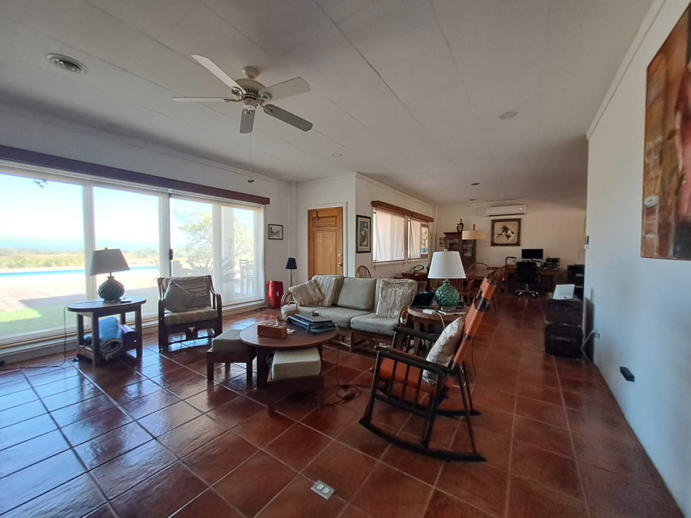 outdoors, an open-concept living room, and a kitchen, a large terrace with access to the pool.