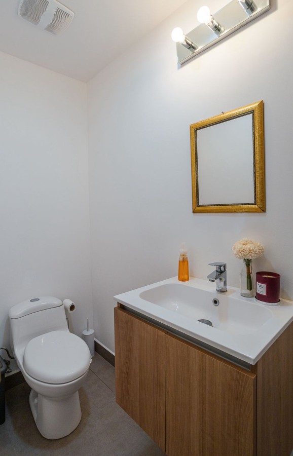 Half guest bathroom, living room, dining room, kitchen (includes dishwasher) with island and