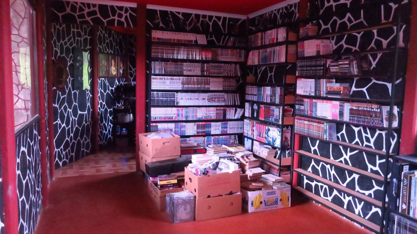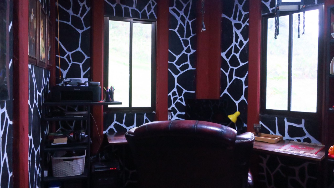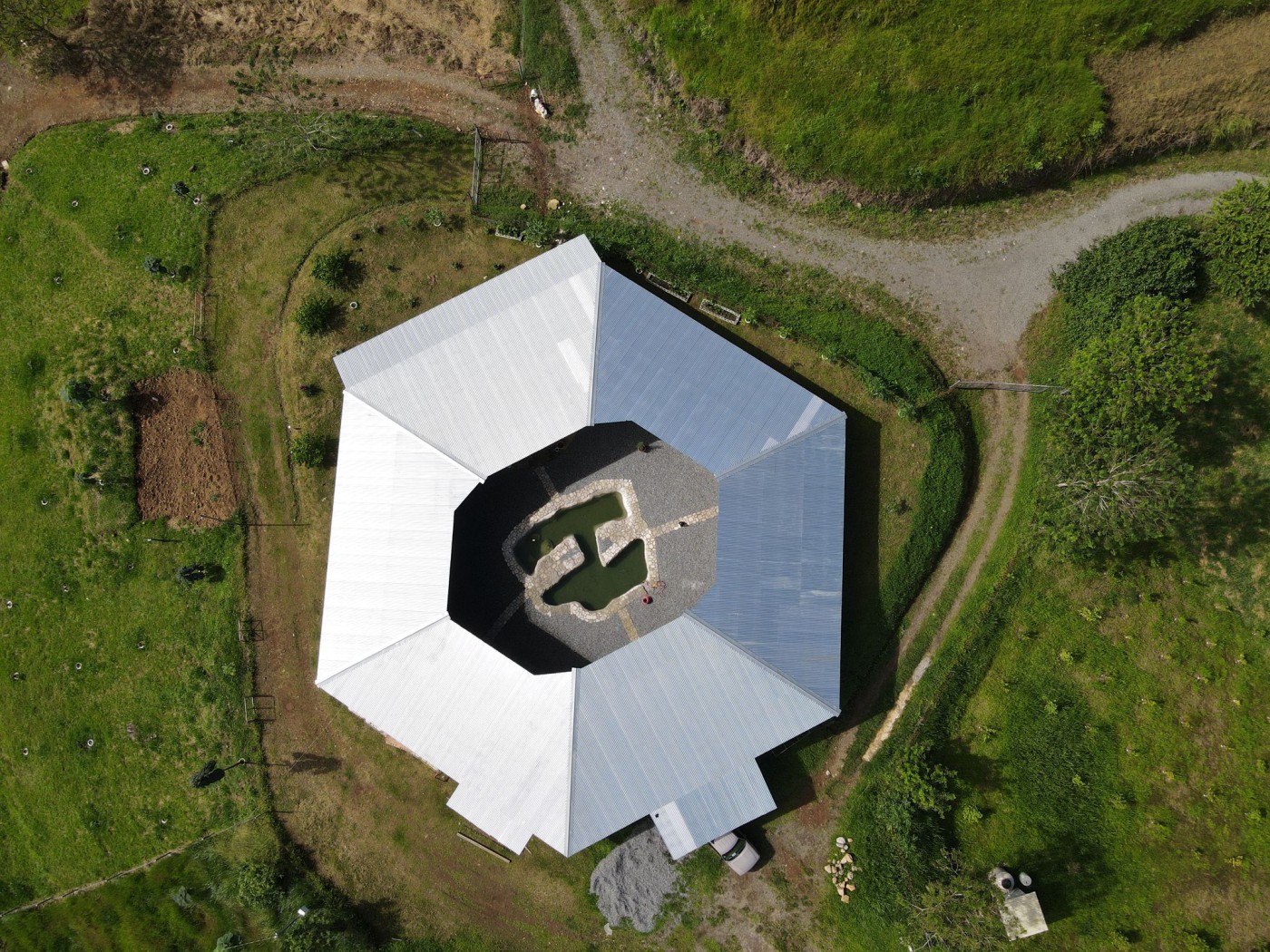 A house of hexagon shape with an inner garden and a big pond full of koi carps in the middle.