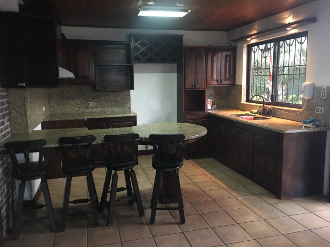 La cocina cuenta con muebles de madera, sobre de granito con desayunador con bancos giratorios.