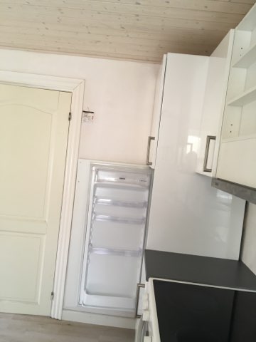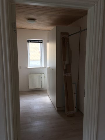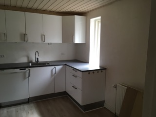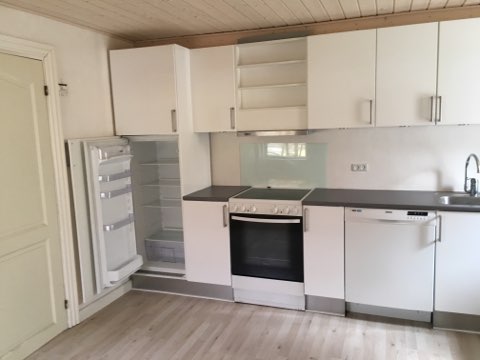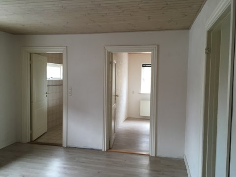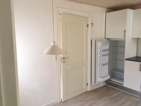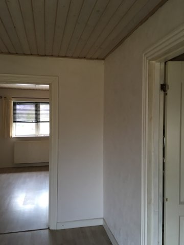 Entryway with room for washer/dryer and a kitchen table with sink. To the right a storage room of aprox 12-15 m2. to the left entry into kitchen area and from kitchen into dining/living room. From there entrance to living room - and a childrens bedroom/storage room/Walk-in closet, and the bathroom with lots of space and a shower. Acces to 1 floor that can be convertet into 2 rooms or one big living areal.