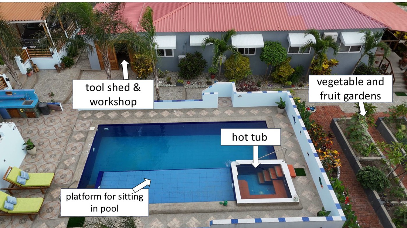 • Large, gas heated swimming pool with tanning ledge and jacuzzi