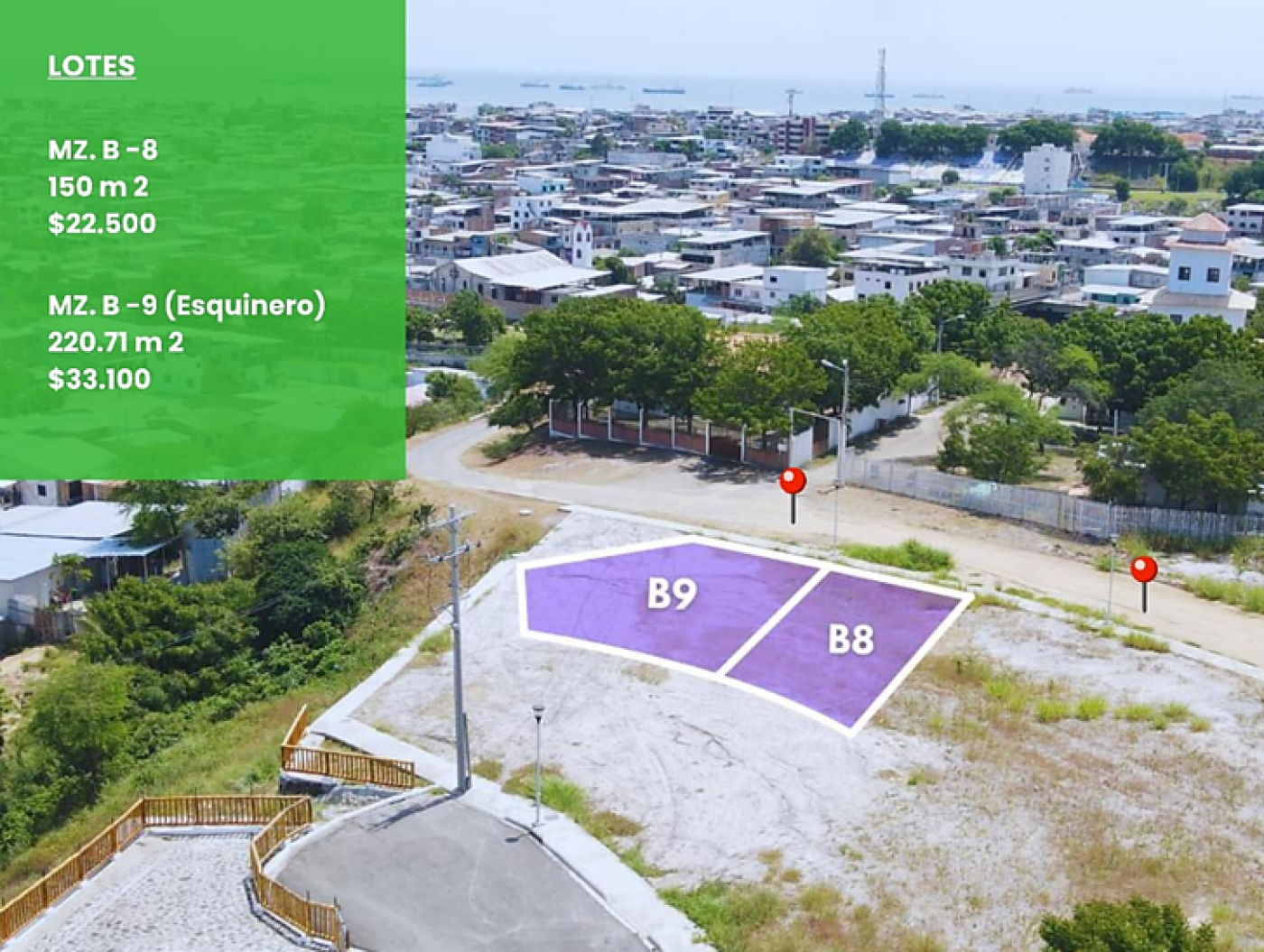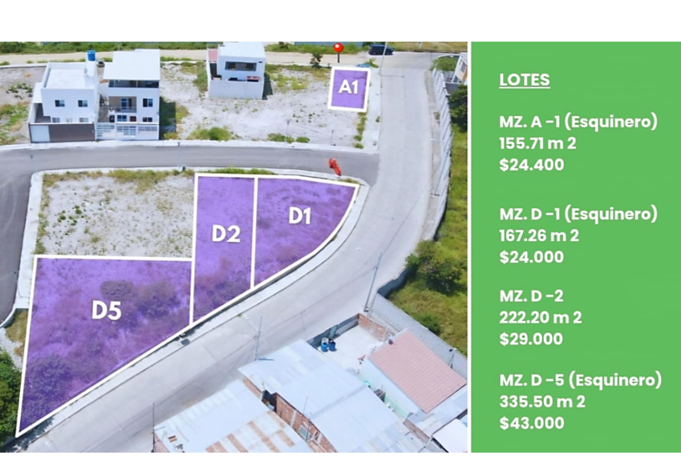 Property Overview: - Type: Plot of Land - Price: From USD 22,500 - Area: 150 m2 to 335.5 m2 - Location: Linda Vista, Manta