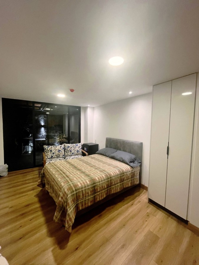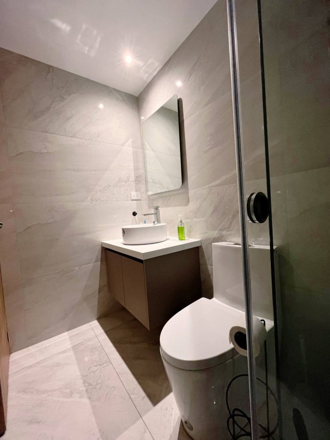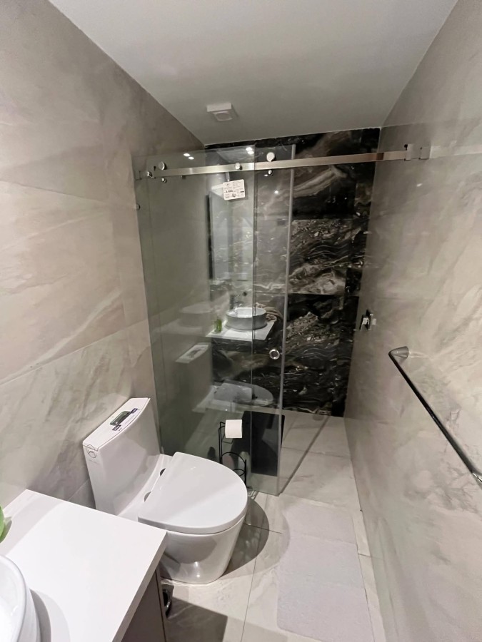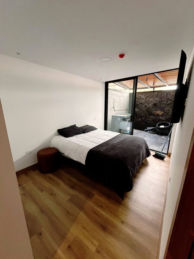 High-end finishes include natural and volcanic stone, porcelain tile flooring, and premium floating floors. The fully equipped kitchen boasts a cooktop, microwave, and range hood. Residents enjoy access to a communal laundry area with washer and dryer, a rooftop terrace with spectacular views, and elevator service.